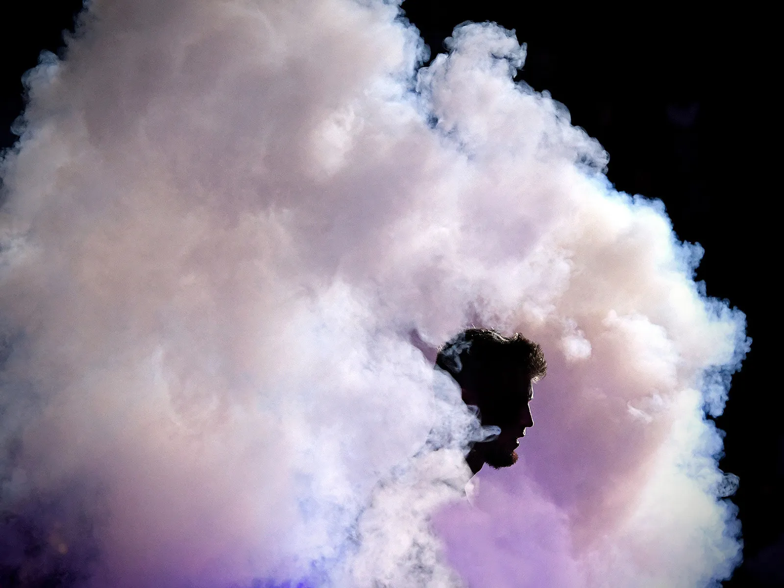 K-State's Dean Wade emerges through a cloud of smoke during team introductions before the game against Kennesaw State at Bramlage Coliseum in Manhattan, Kansas.