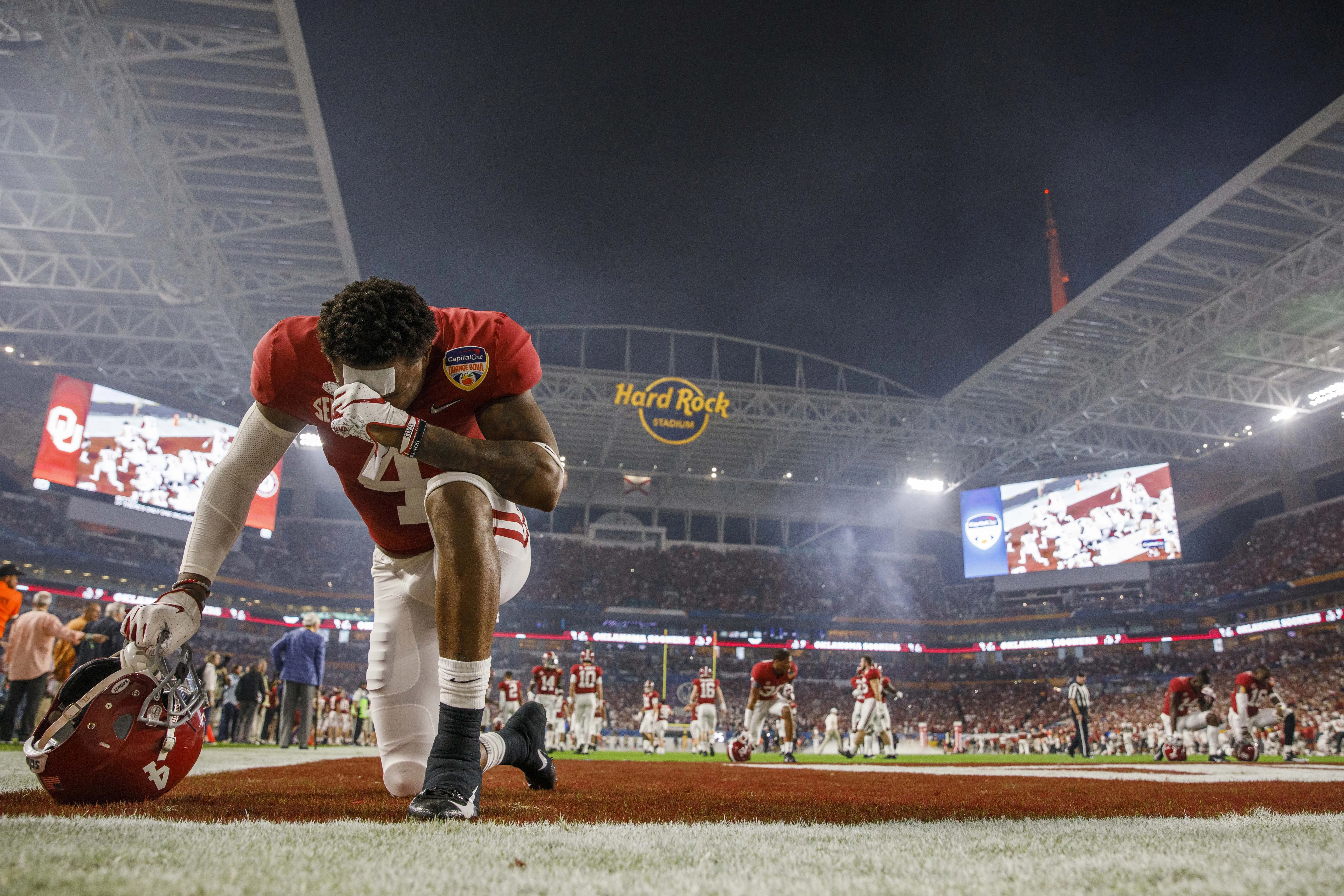 University of Alabama football player pauses for a moment or prayer prior to the Orange Bowl