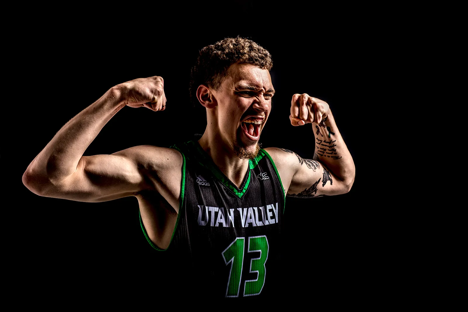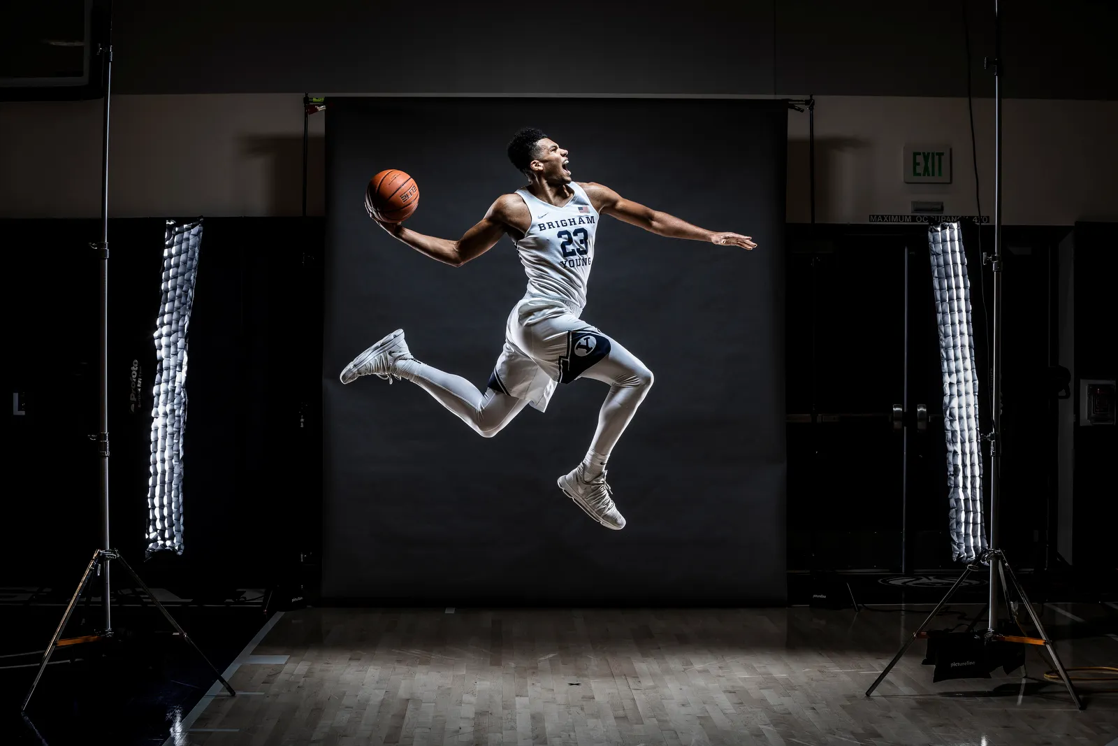 Yoeli Childs posing for the men's basketball promo shoot.