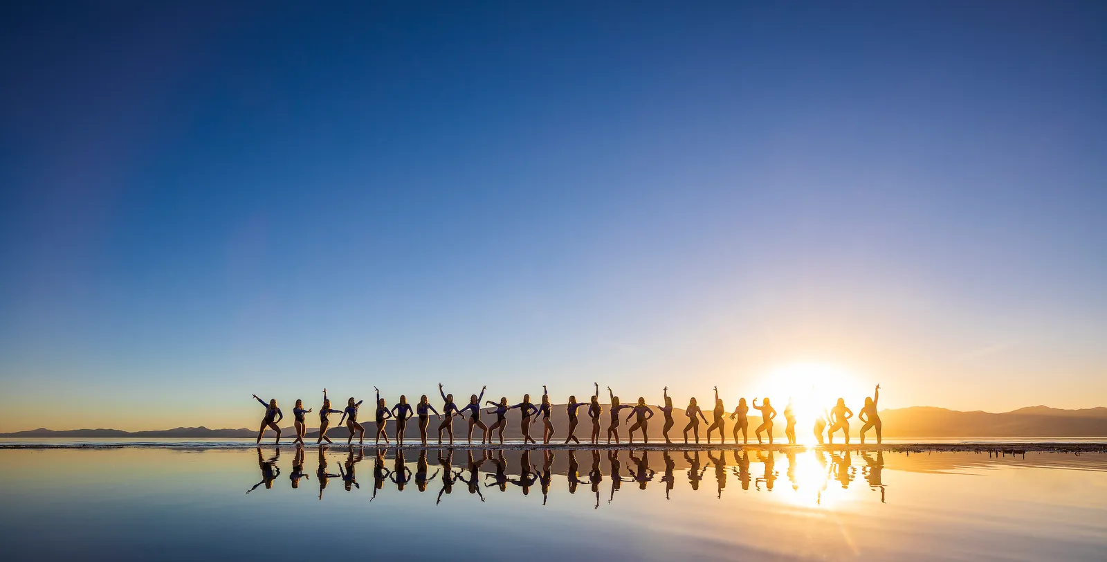 Women's gymnastics team poses for a photo at the nearby lake during sunset.