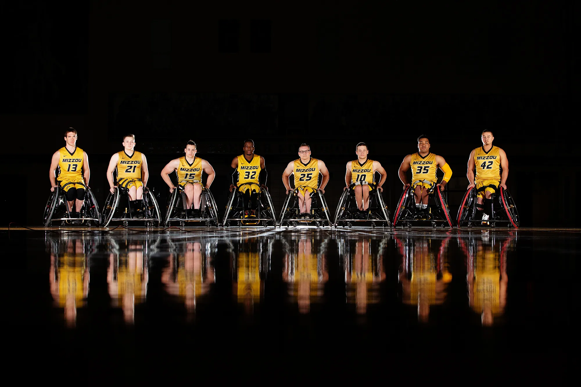 Promotional photo of the 2018-19 Men's Wheelchair Basketball team at the University of Missouri.