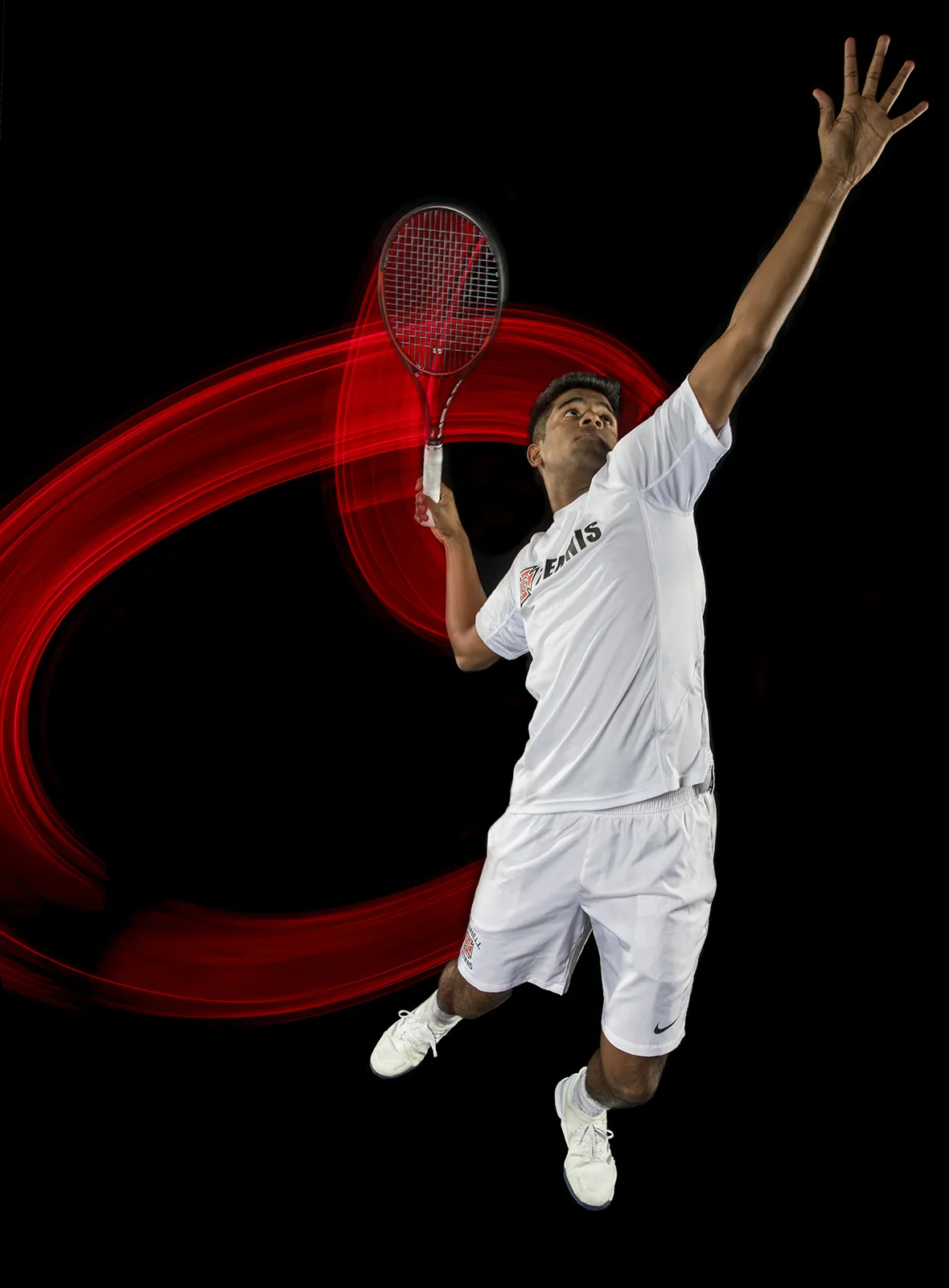 The racquet path of Sriram Sugumaran's serve is illuminated in his tennis promo image.