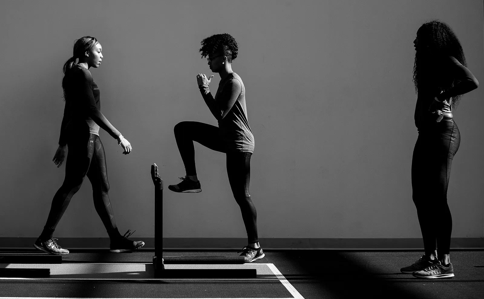 Austin Peay hurdlers Denia Hill-Tate, Kamille Dunbar, Myiah Johnson take part in warm-ups at the Commodore Invitational.