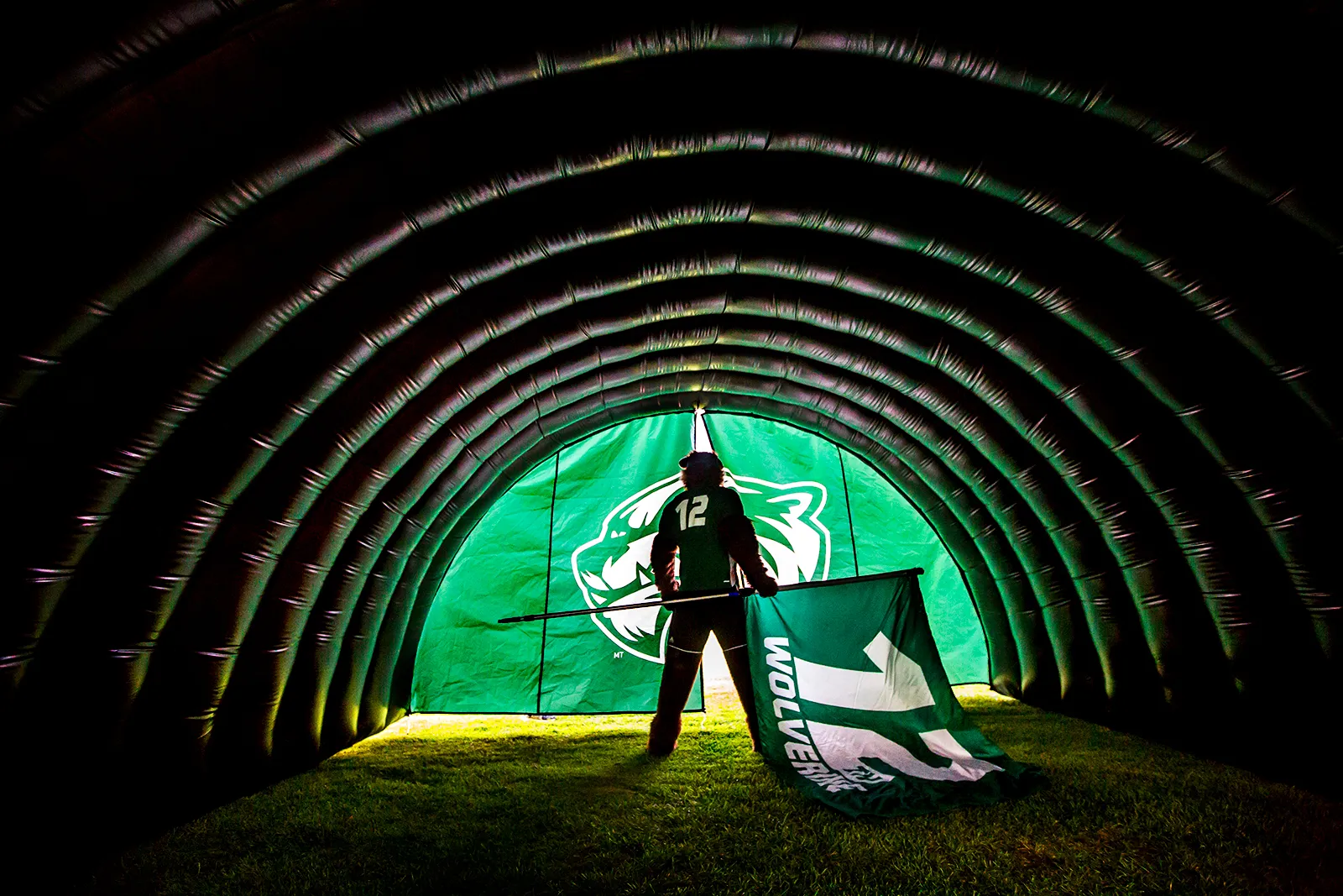 The team mascot stands in the tunnel waiting to lead the team onto the field.