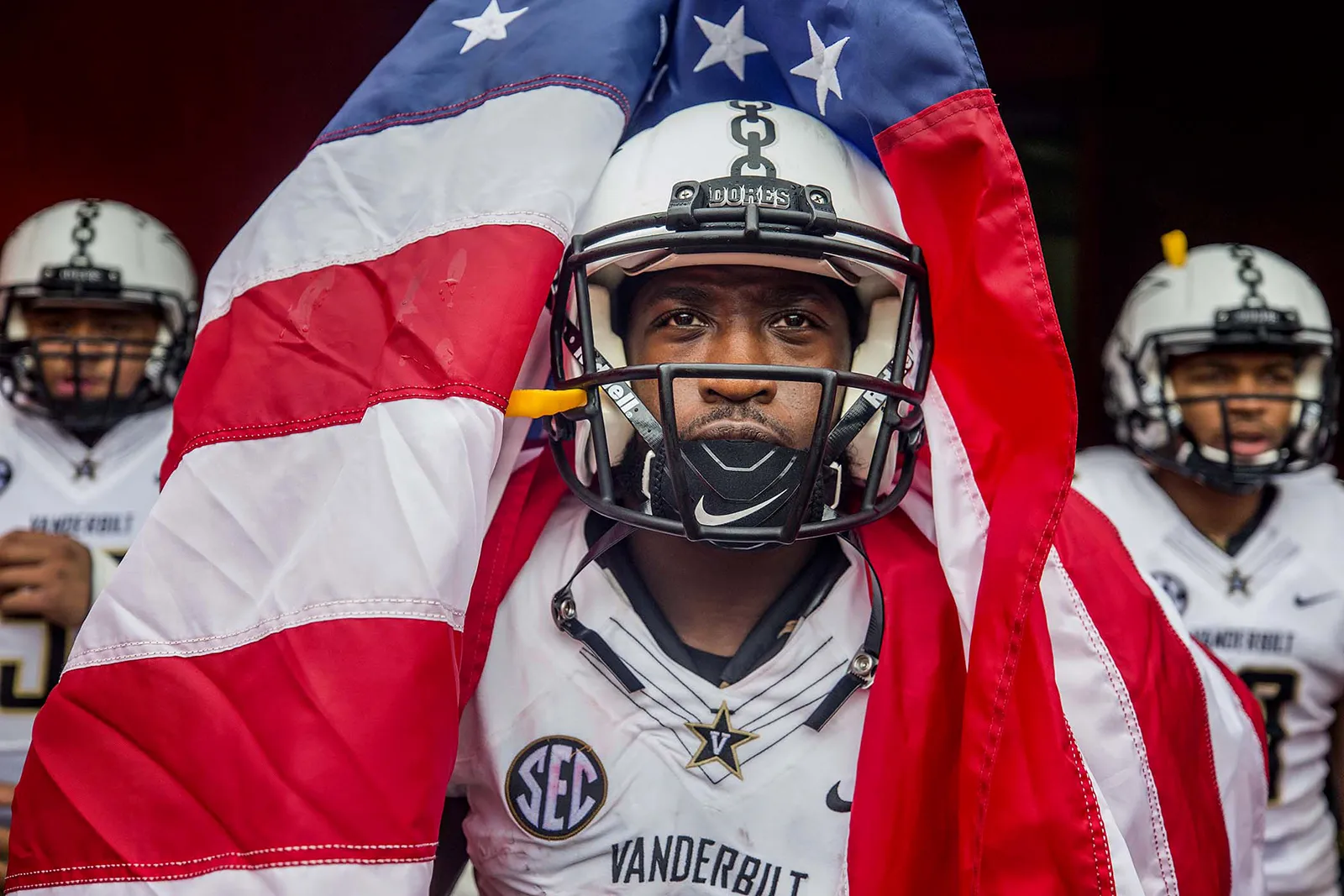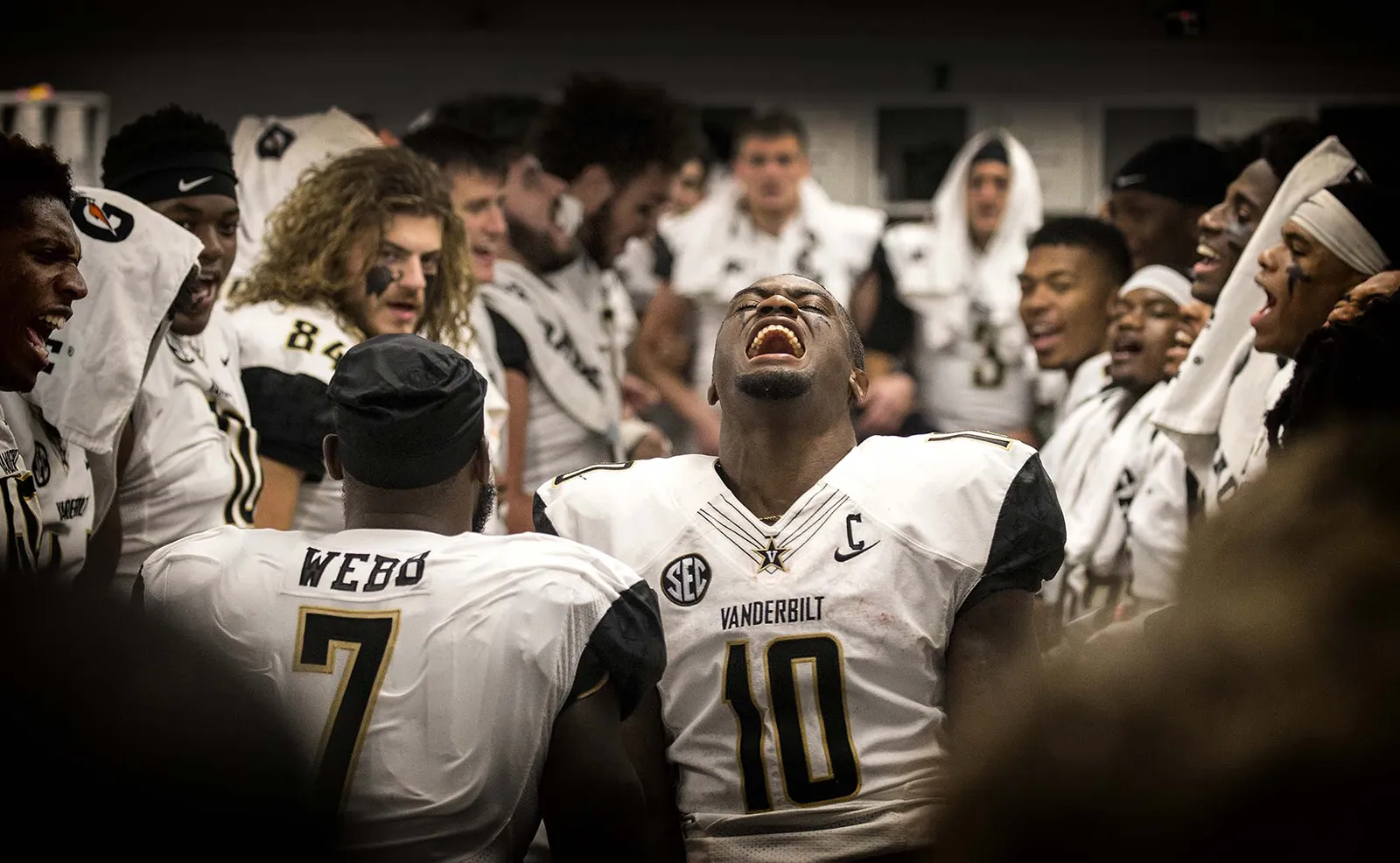 Captain Trent Sherfield gets his teammates pumped up as Vanderbilt prepares to plays Florida in an NCAA football game at Ben Hill Griffin Saturday Sept. 30, 2017, in Gainesville, Florida.