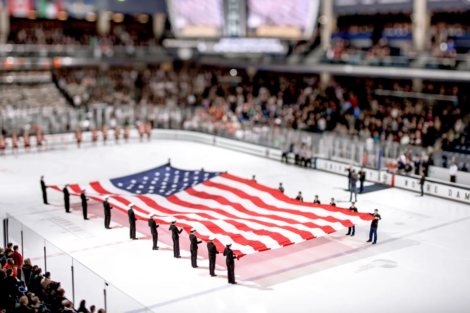 ROTC cadets and midshipmen hold an oversize U.S. Flag during the national anthem.