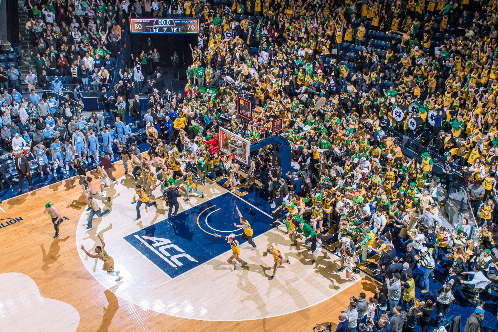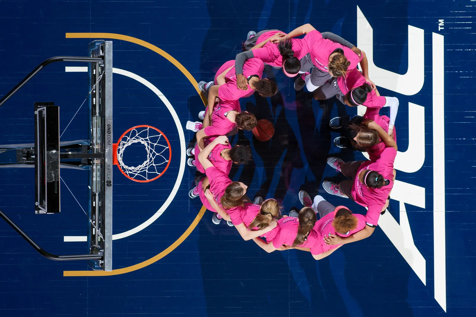 The Women's Basketball team huddles in their special "Pink Zone" game warmups. The Pink Zone game is an annual fundraising event where both teams wear pink uniforms in recognition and support of breast cancer research.