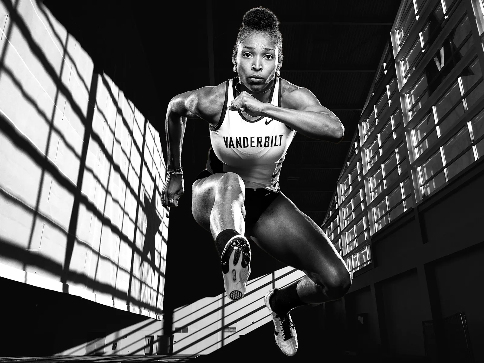 Faith Washington, a qualifier for the 2015 NCAA 400m Hurdles, prepares for the upcoming indoor season. Track promotional shoot.