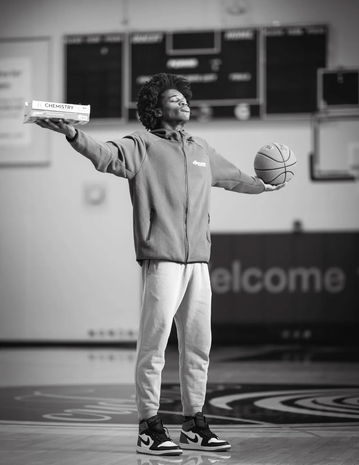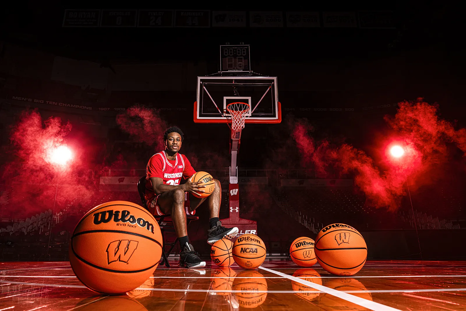 John Blackwell is photographed for our alumni magazine on the Kohl Center court utilizing four lights, canned fog, red gels, and plentiful basketballs.