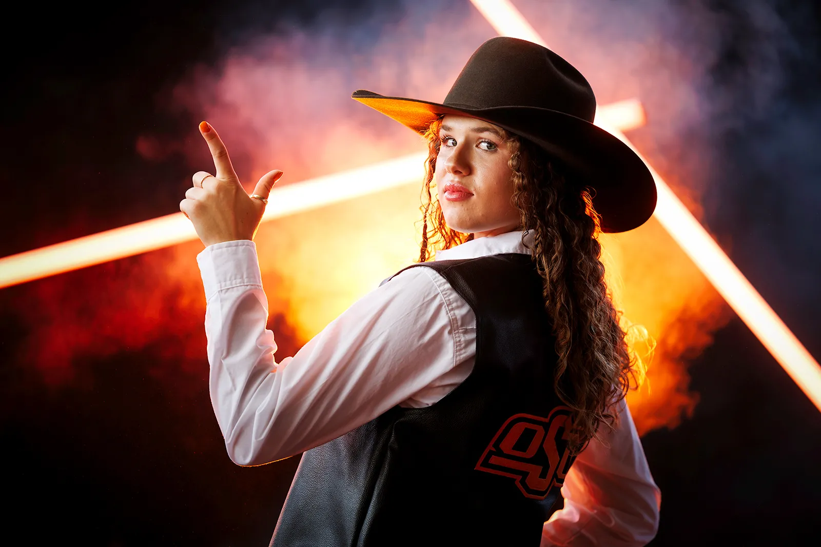 Harli Gomes, a member of the Cowboy Rodeo Team, poses for a photo during the annual rodeo team media day at the OSU Rodeo Arena on Tuesday, Sept. 3, 2024.