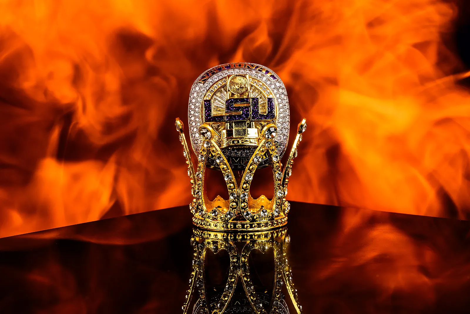 Flames surround the LSU Gymnastics 1st National Championship ring during a studio shoot.