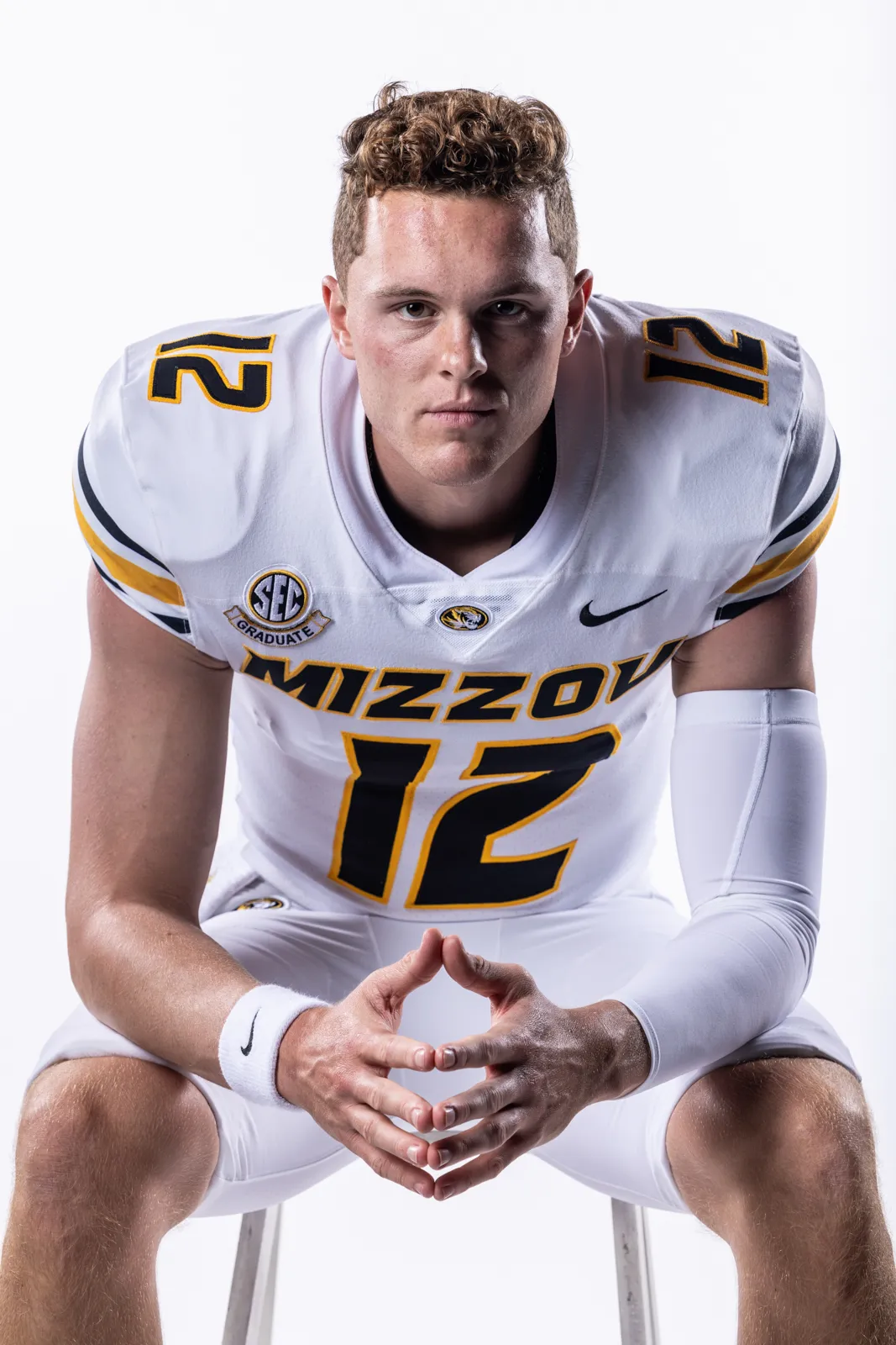 Photographed for the alumni magazine, Brady Cook stands for a portrait in the studio. He’s been through a lot while on the football team. His evolution has brought about the evolution of the Mizzou fan base’s perception of this true son, too. As he enters his senior season after defeating Ohio State at the Cotton Bowl last season, all eyes look to what he will do next.