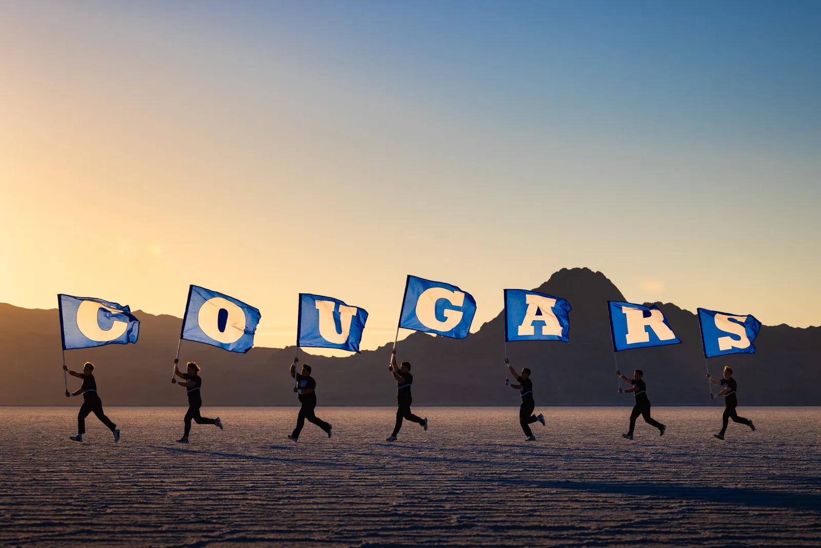 BYU Cheer runs the "COUGAR" flags across the Bonneville Salt Flats.