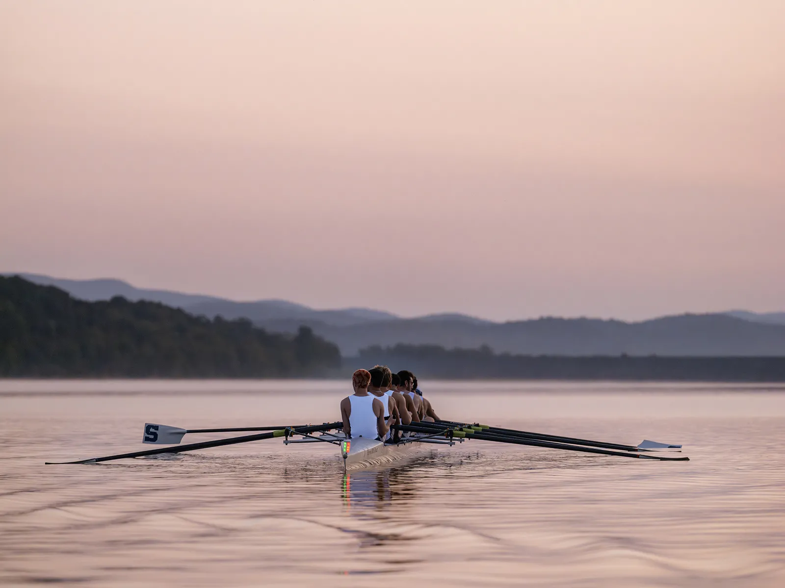 Sunrise with the Penn State Crew team on the Foster Joseph Sayers Reservoir. The men's varsity rowing team prepare their oars for the catch position as their shell drifts into starting position.