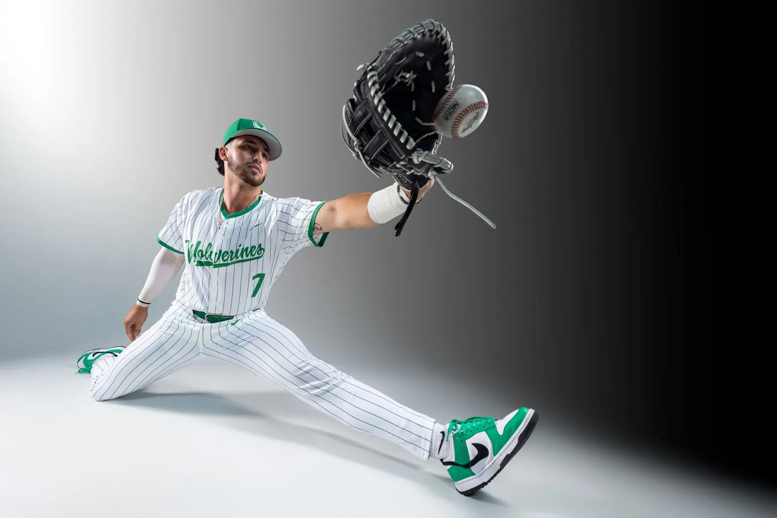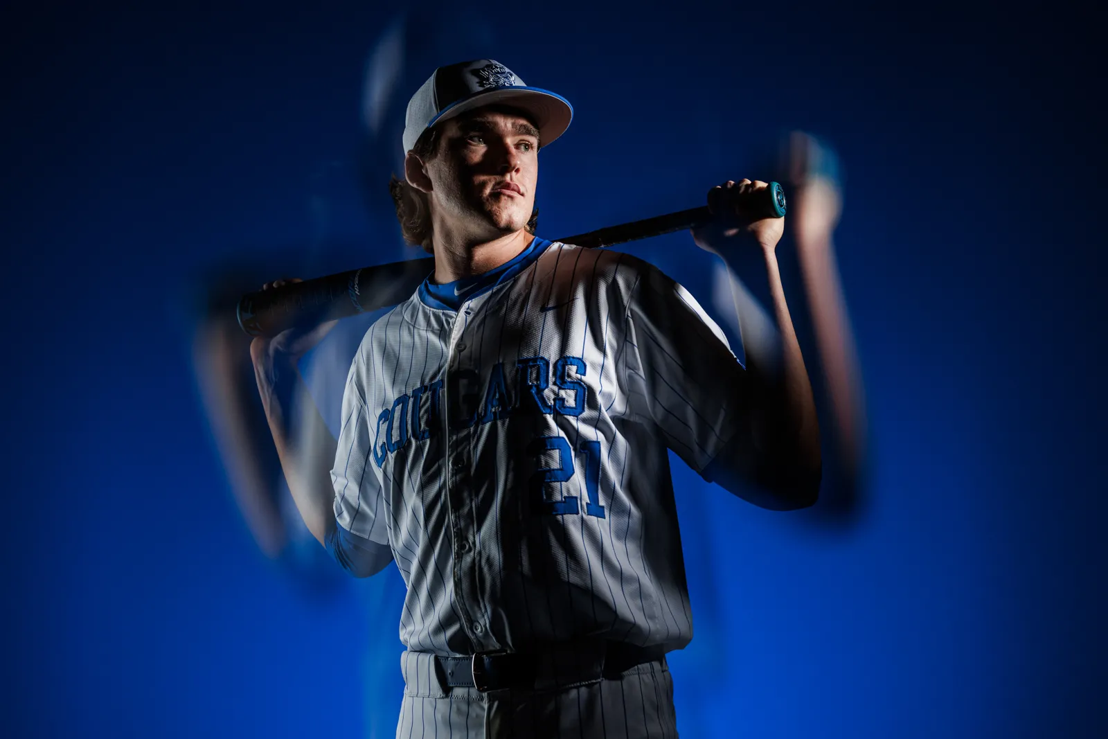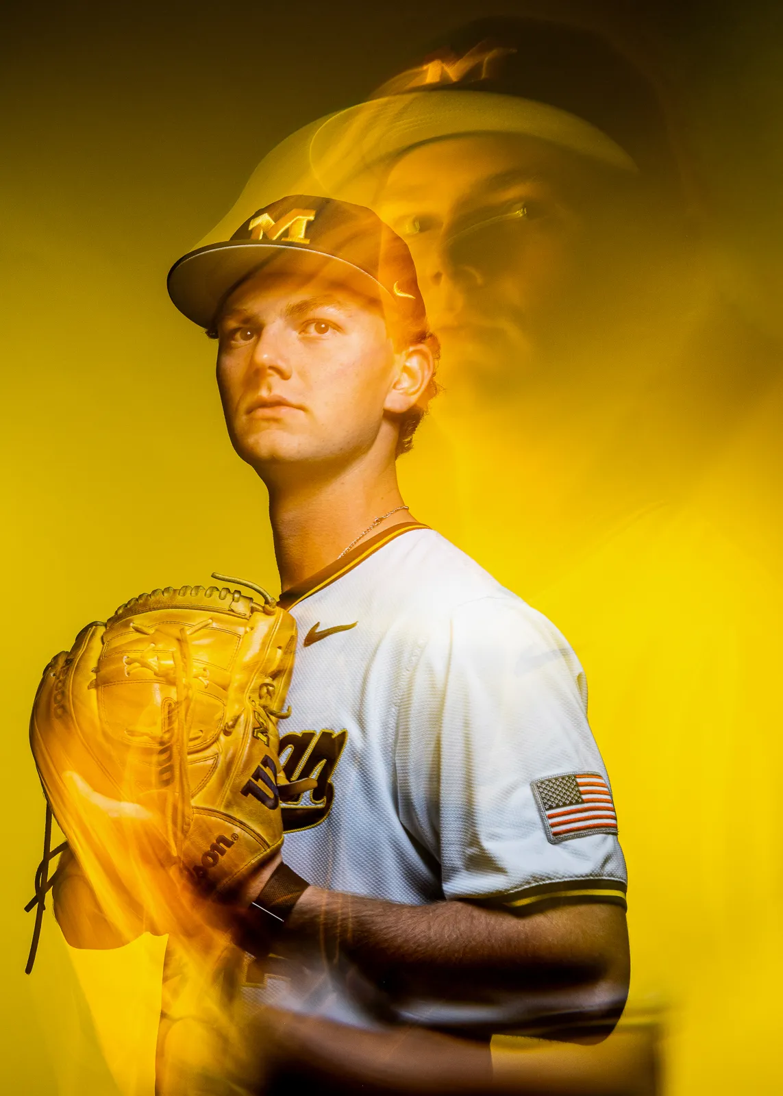 A long exposure and shutter drag portrait of University of Michigan right handed pitcher (#42)Justin Brown.