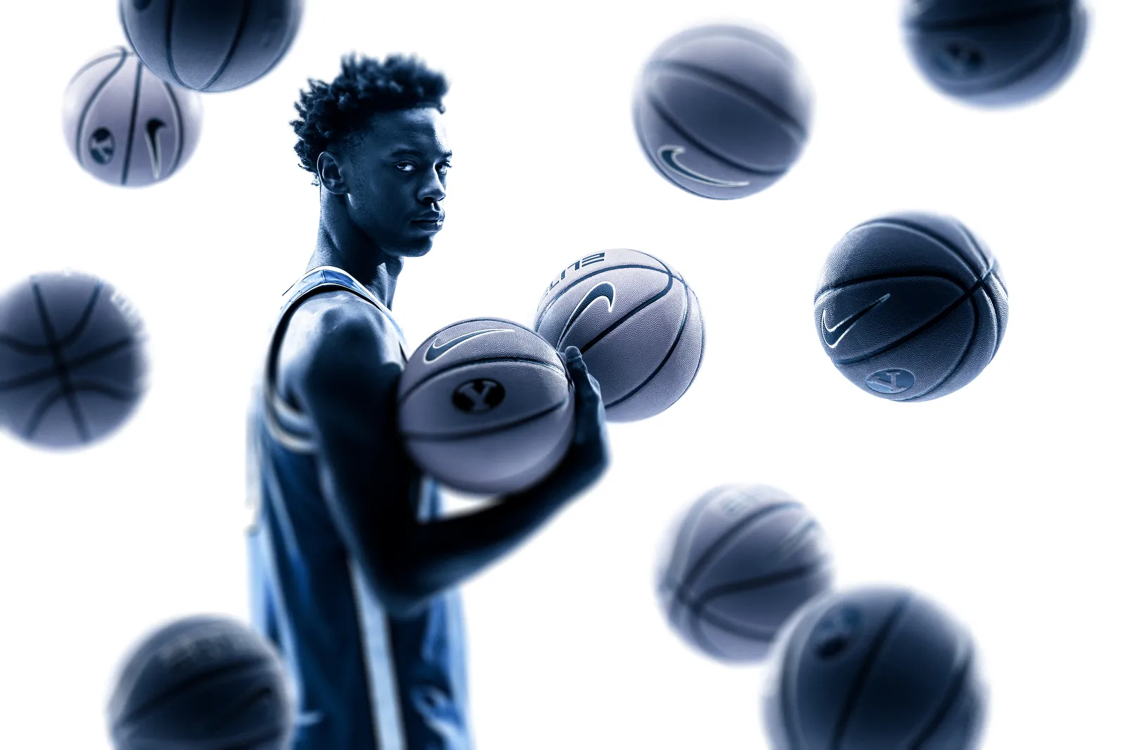 Star player AJ Dybantsa during promo shoot for men's basketball. Basketballs composited in.