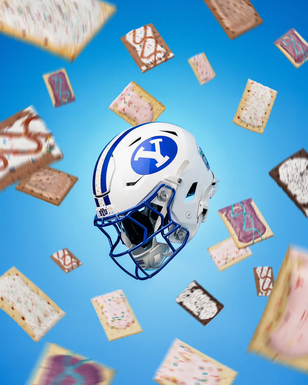 Photo of BYU Football helmet and Pop Tart pastries. Images used to market BYU's bowl game invite to the Pop Tarts Bowl.