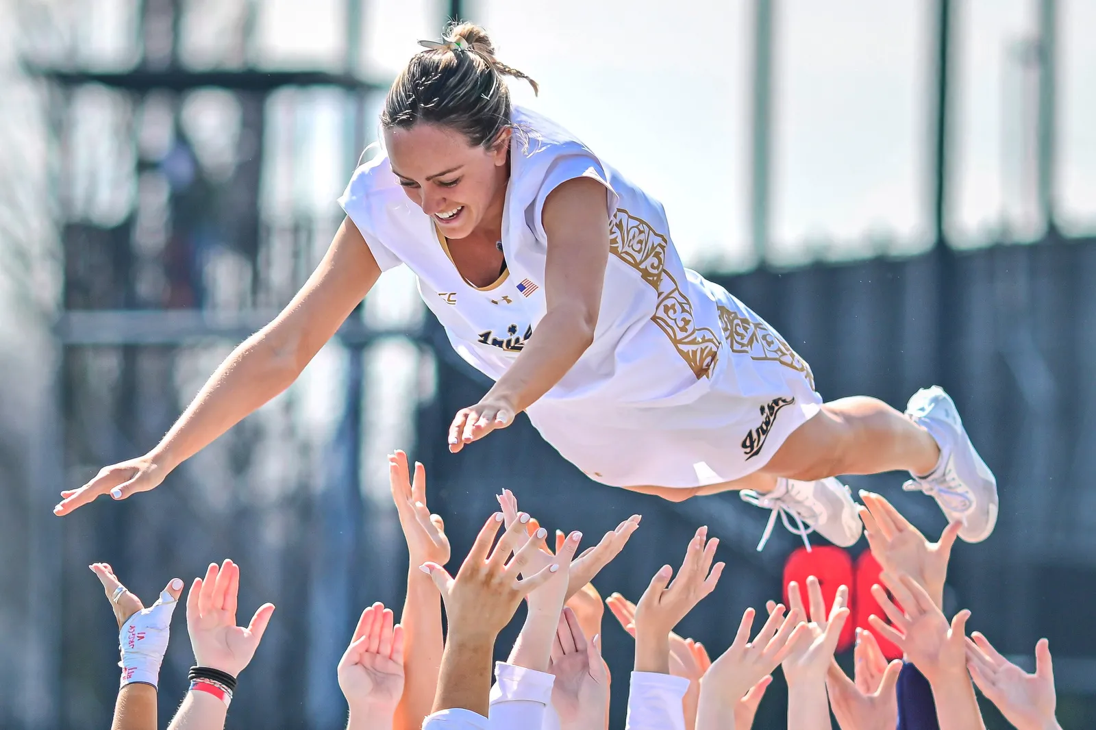 Erin Hooper (51) is tossed into the air after a goal in the game against Pitt.