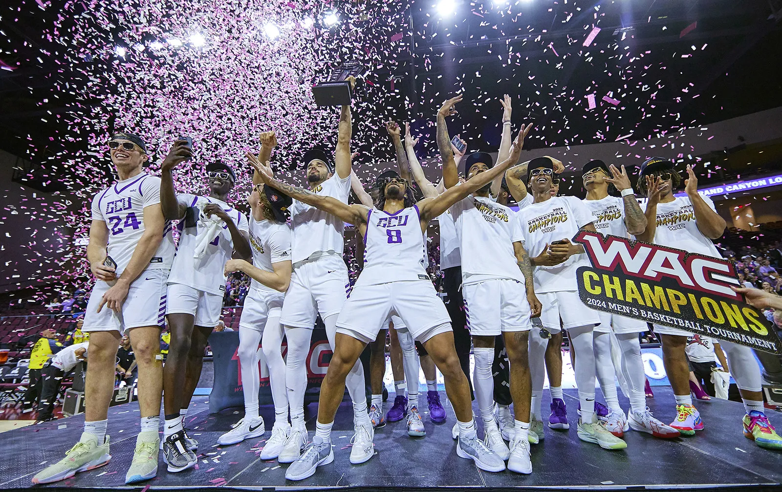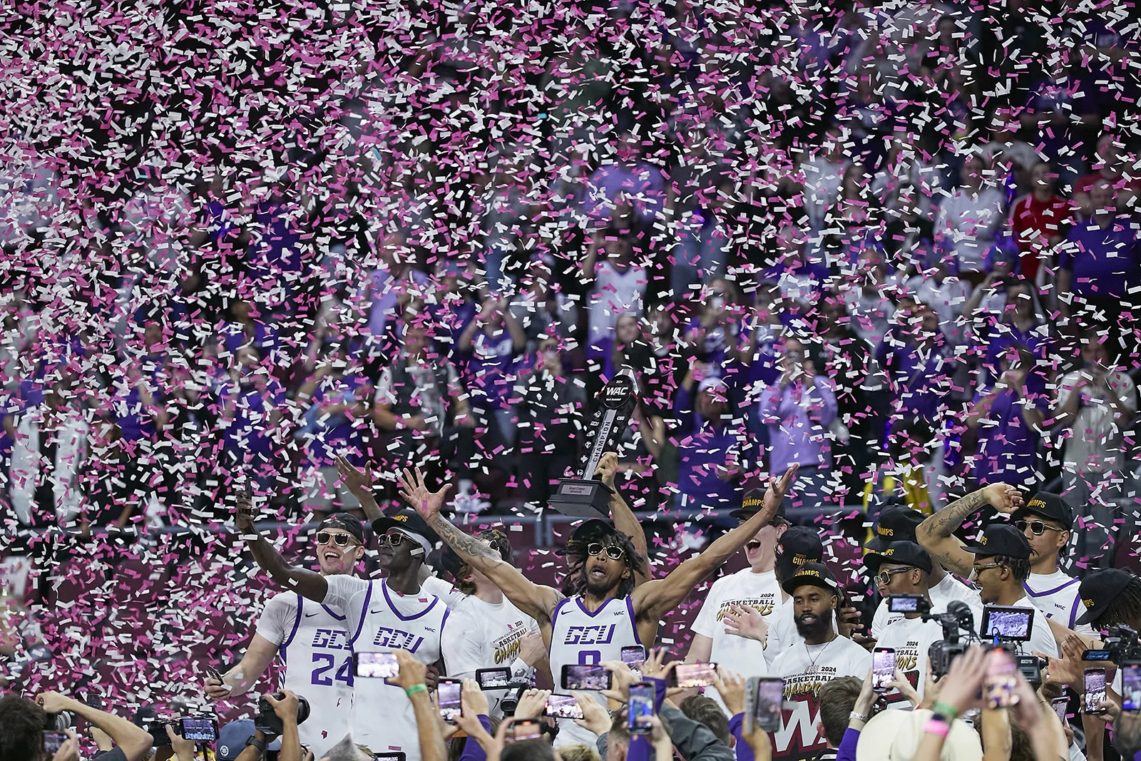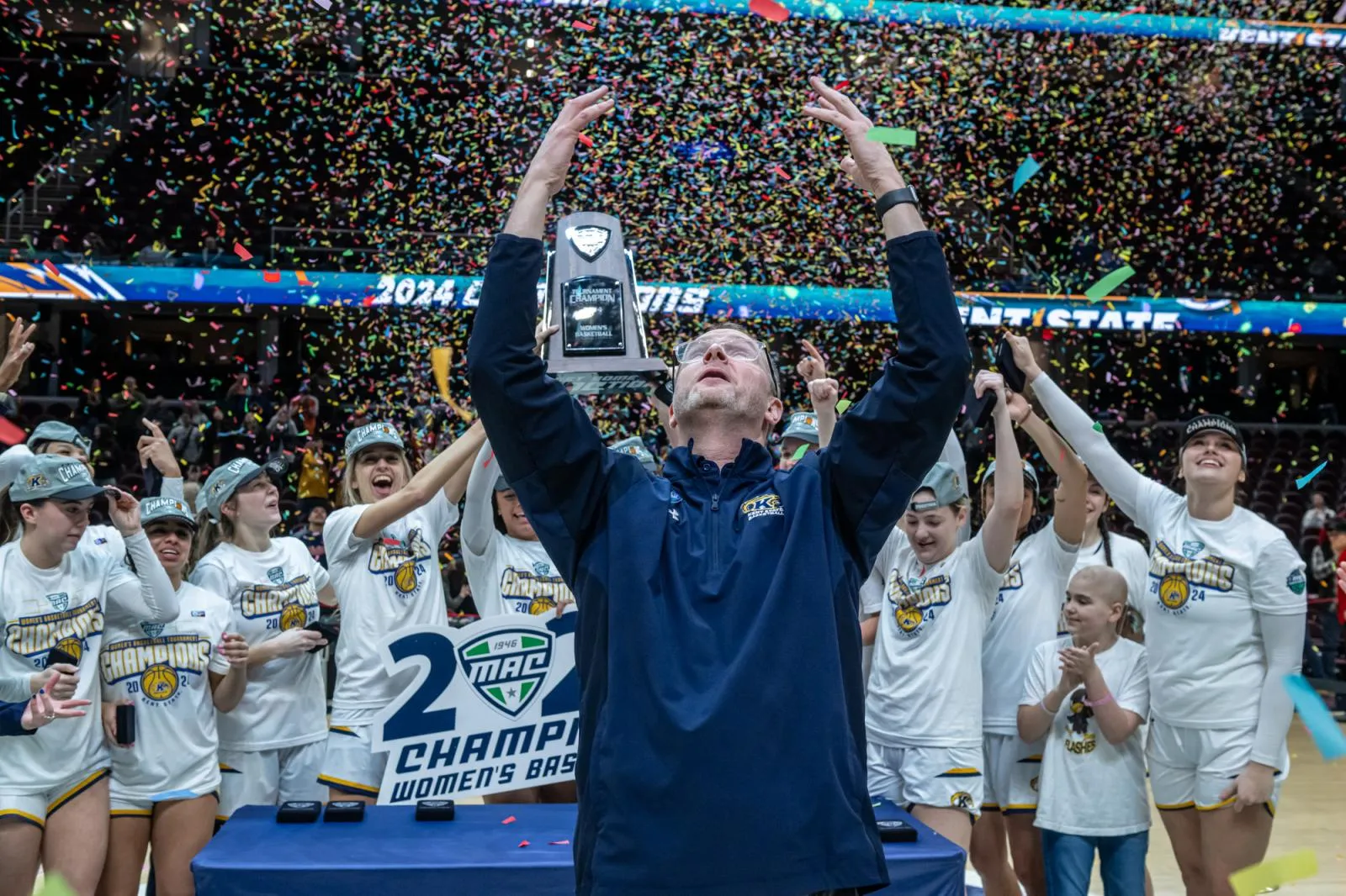 Head basketball coach Todd Starkey basks in the moment with his team after they won the MAC Tournament for the first time in 20 years.