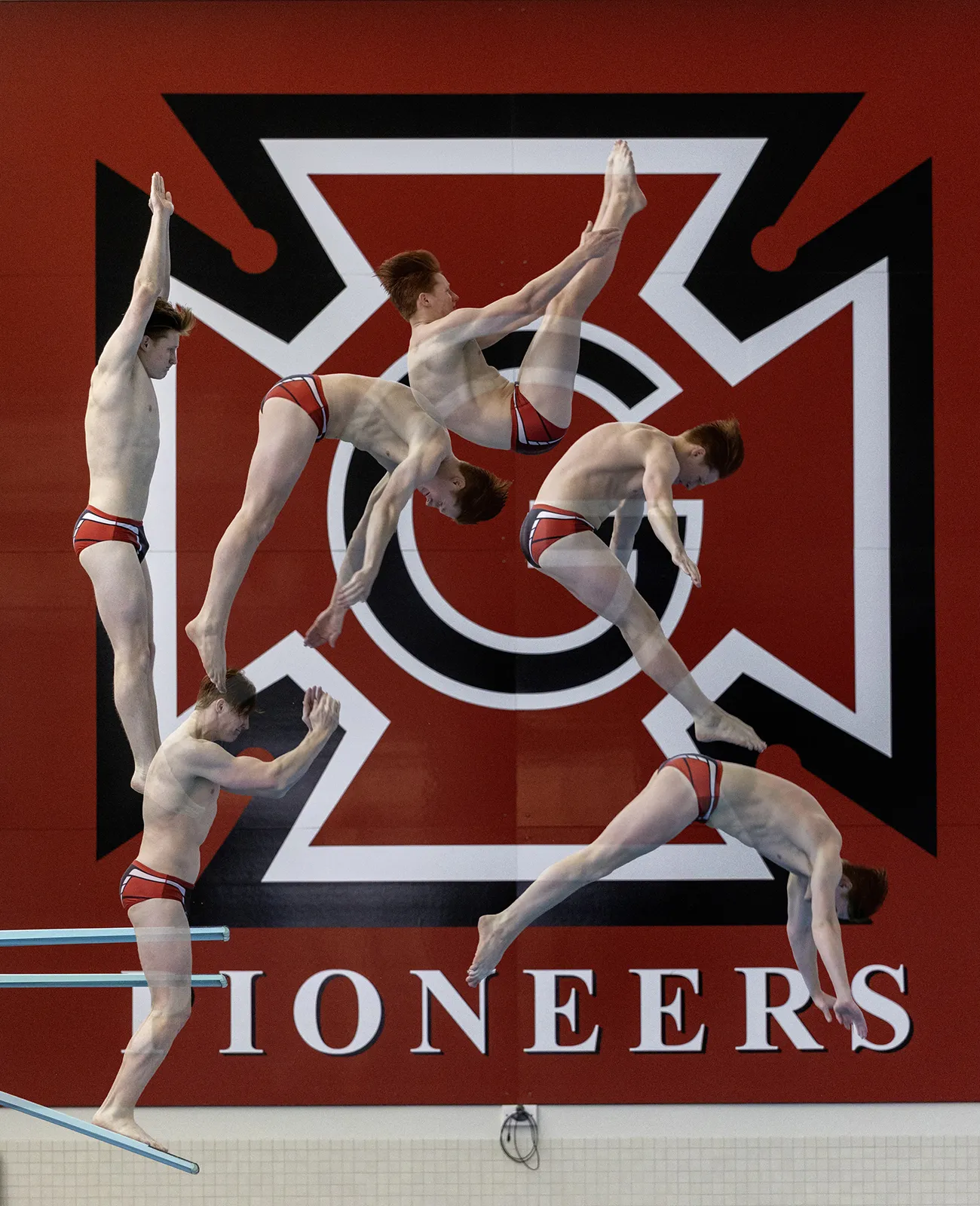 Multiple exposure of Toby Frick from one of his 3-m dives during the Midwest Conference Championship meet. Frick won 1st place.