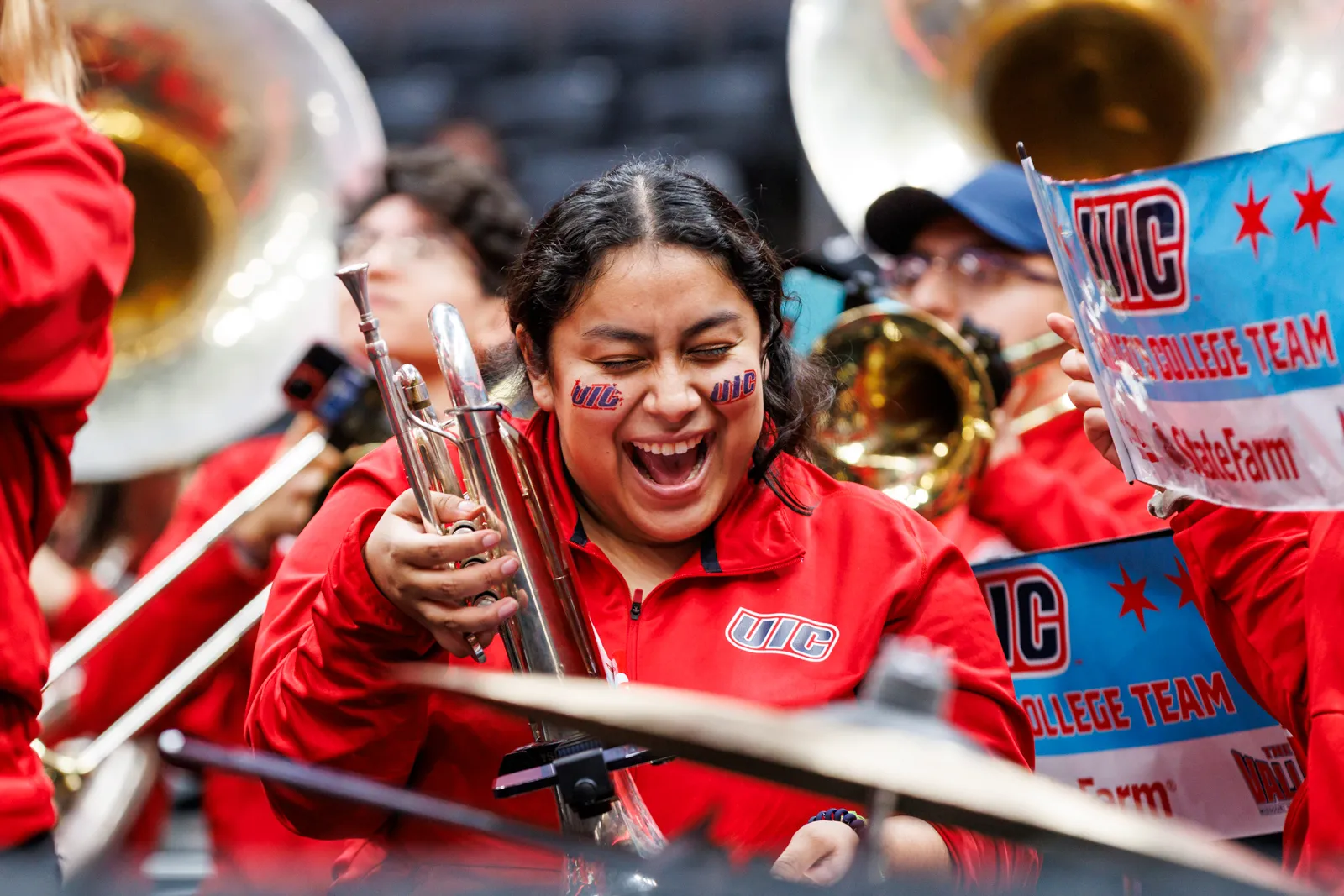 A member of the pep band with their instrument during a basketball game on March 7, 2024.