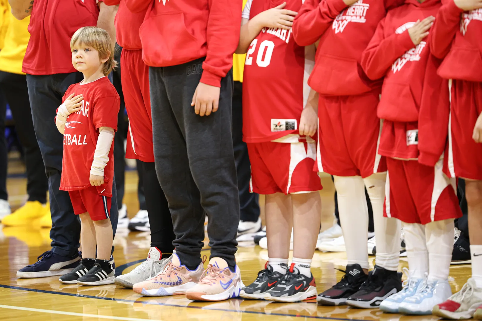 A member of the Sacred Heart Youth Basketball program stands alongside his teammates during the playing of the national anthem before a Hofstra University basketball game on Jan. 6th, 2024.