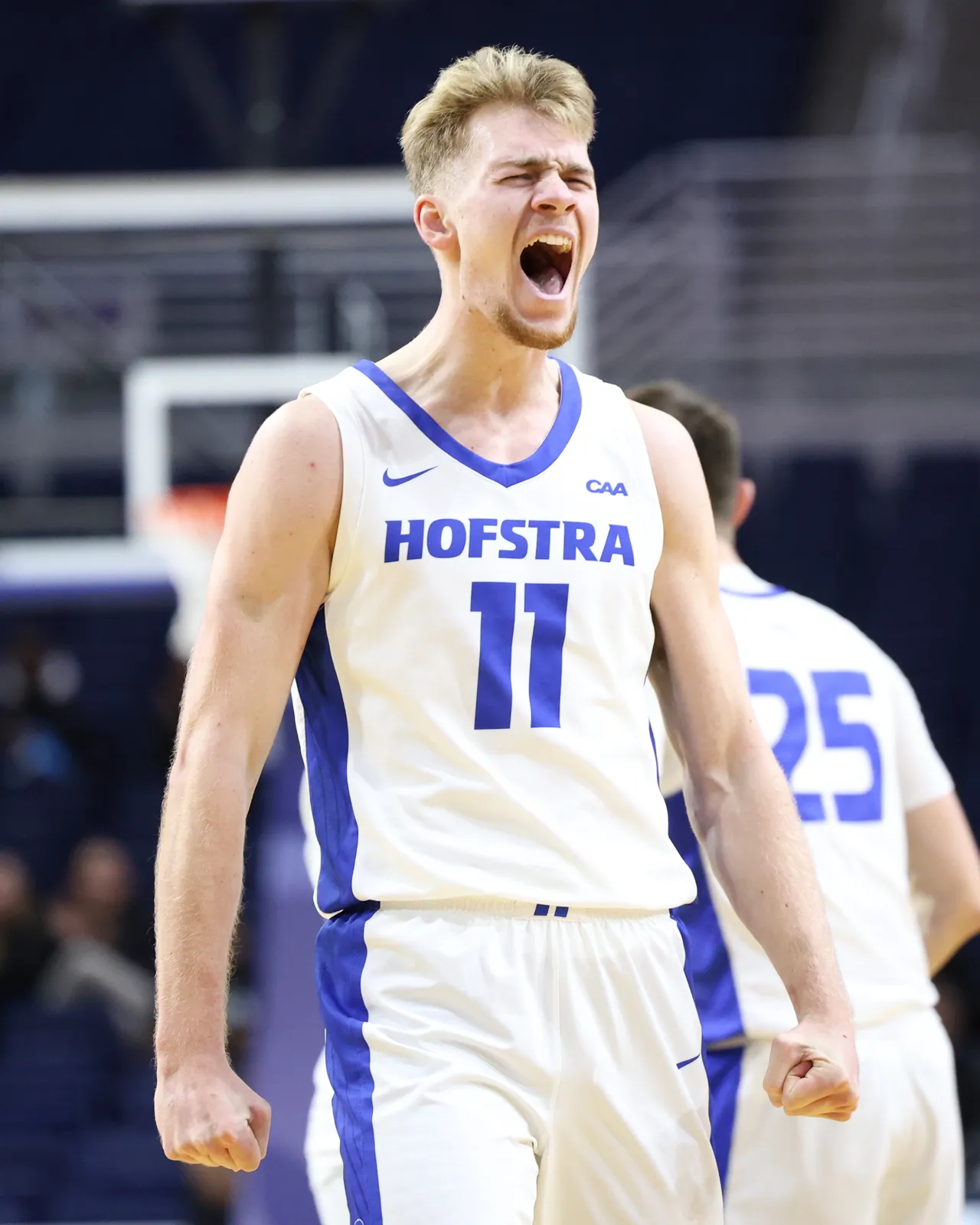 Hofstra University's Jacco Fritz (11) lets out a victory cry after the Hofstra Pride win 86-77 against Hampton University on Jan. 18th, 2024.