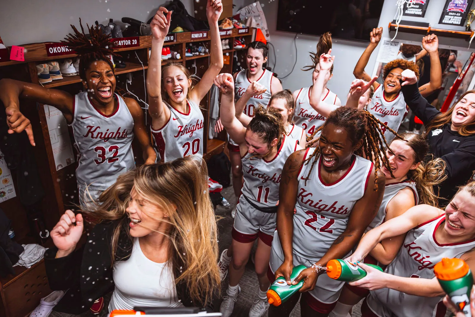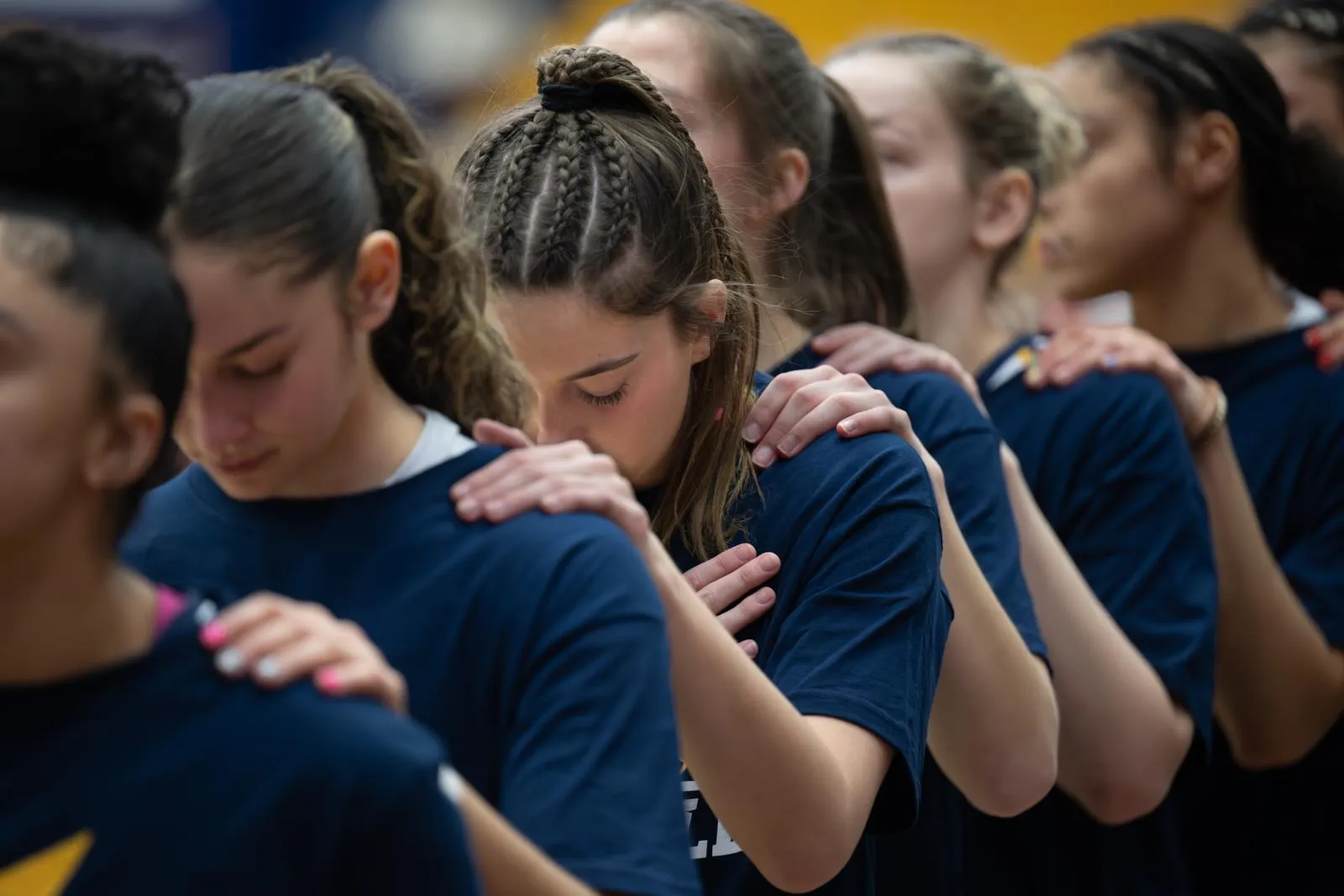 Members of the Women's basketball team hold their hands over their heart and their other on their team mate's shoulder before the start of a game.