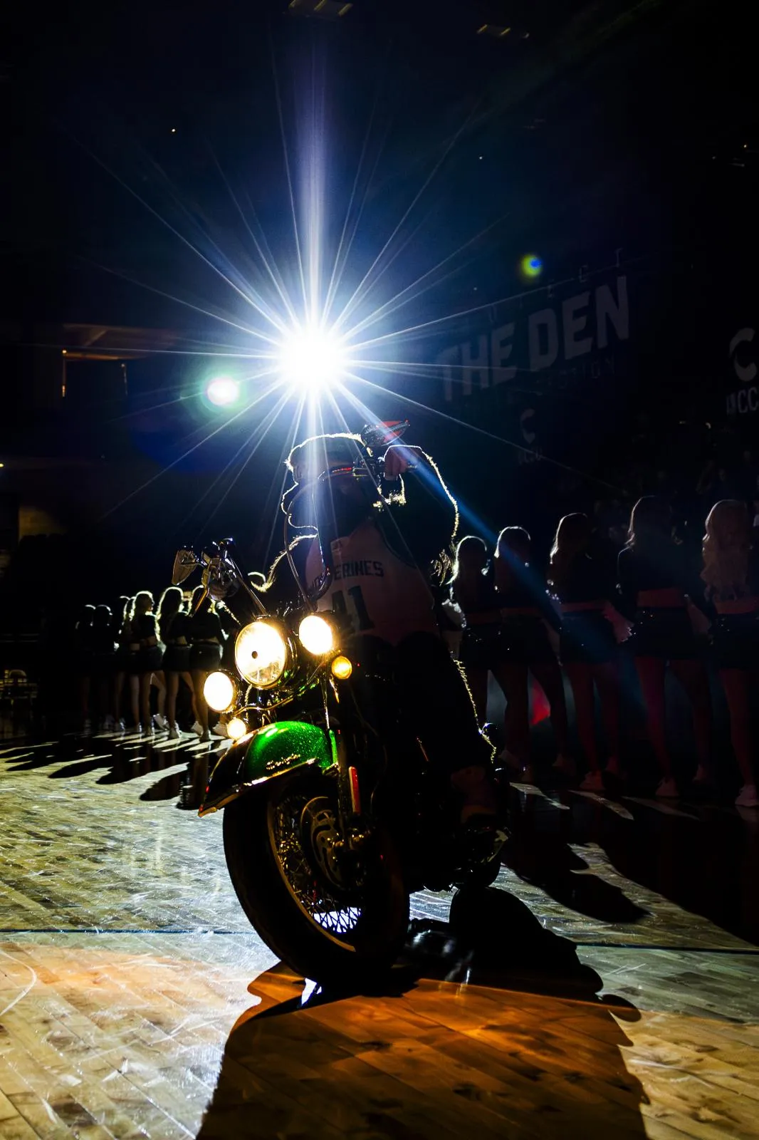Willy the Wolverine rides out to pump-up the crowd before the Utah Valley University Men's Basketball team takes on the University of Texas Rio Grande Valley at the UCCU Center on UVU’s Main Campus in Orem, Utah, on Thursday, Feb. 22, 2024.