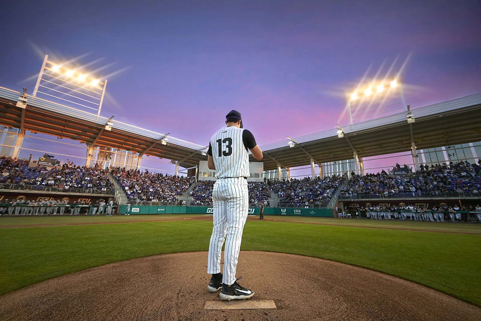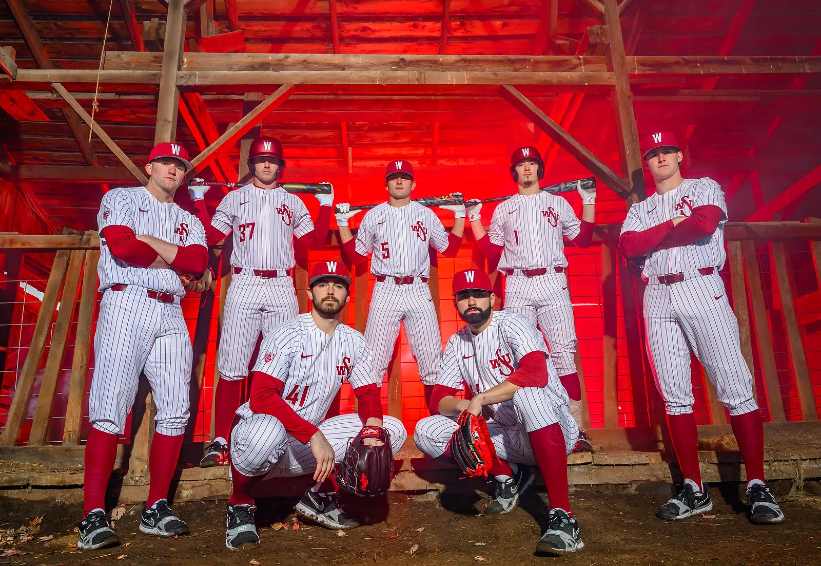 The student leadership of the 2024 Baseball team pose inside the barn that was used as the location and backdrop for the full team group photo.