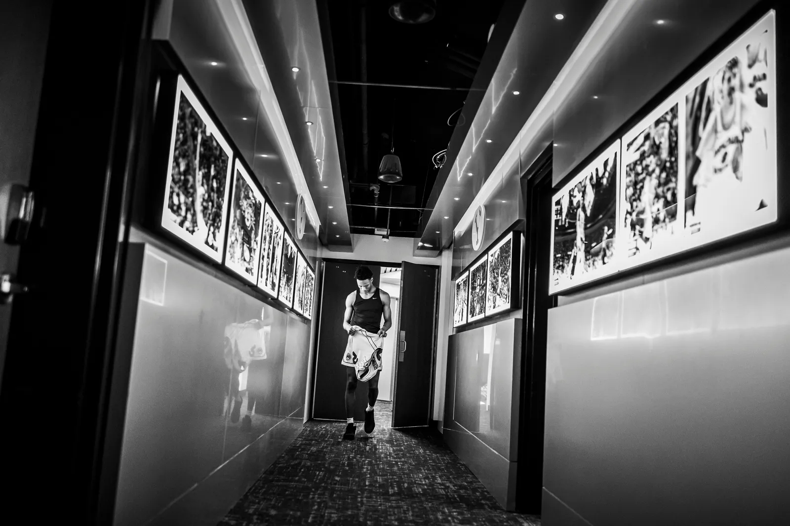 Jackson Robinson walking to the from the locker room to the basketball court before a game.