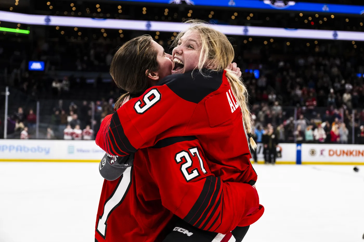 Northeastern's Megan Carter and Kristina Allard scream and hug as they celebrate their Beanpot Championship victory over Boston University at the TD Garden on Tuesday, Jan. 23, 2024. This was the first women's Beanpot game held at the Garden in the women's tournament's 45 year history.