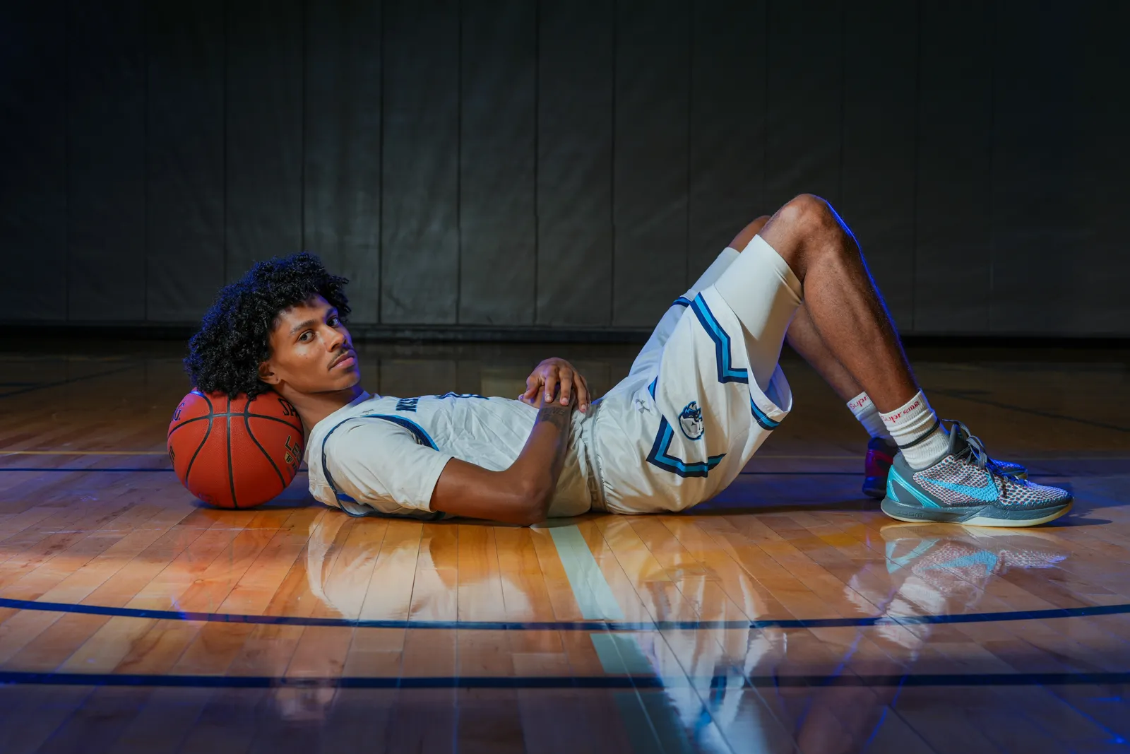 Zach Murphy, forward for Wake Tech Mens Basketball, rests his head on a basketball