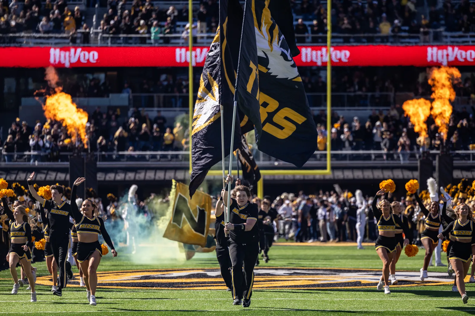 The opening charge by the cheer and dance teams before the football team runs onto the field.