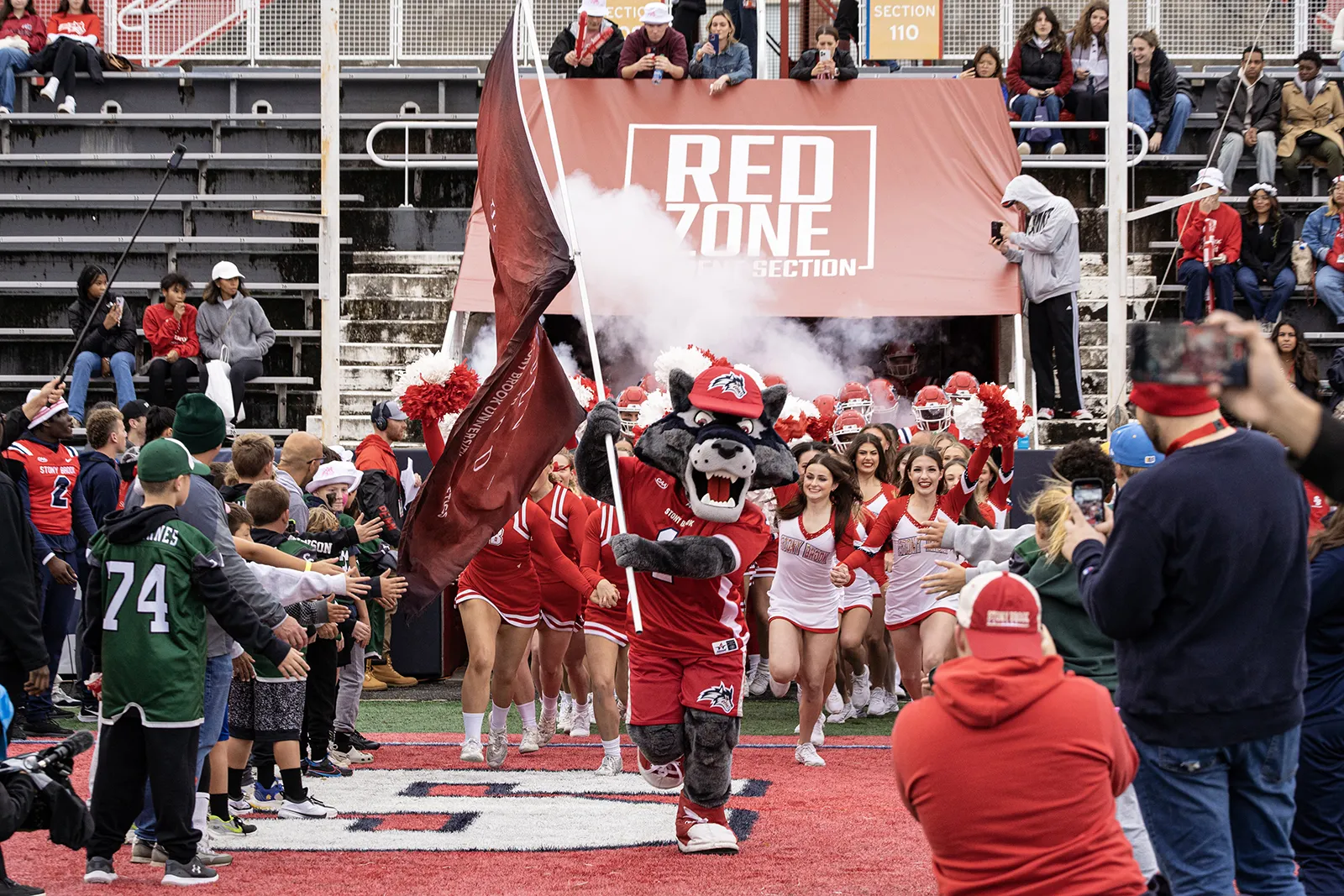 Wolfie leads the Stony Brook University Cheerleaders and football team out on to the field during Homecoming.