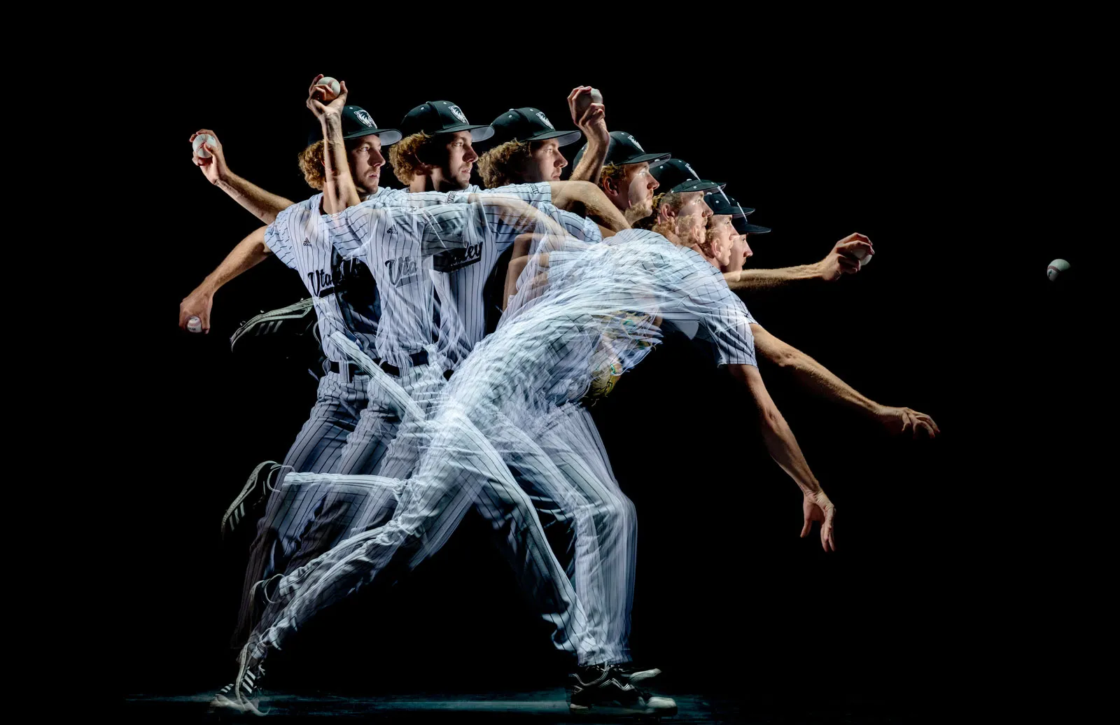 Right-handed starter, Carter Krosky, illustrates the mechanics of his fastball during a photo shoot in the studio. Krosky's elbow surgery kept him from the mound last year, but plans to return this spring. This single-frame image was created in-camera using a two-second exposure and a multiple pop setting on the Broncolor strobe. Two B1x Profoto heads, placed in line with the throw (one to the subject's back and the other to his face) were set to the optical trigger option to sync with the Broncolor positioned overhead.