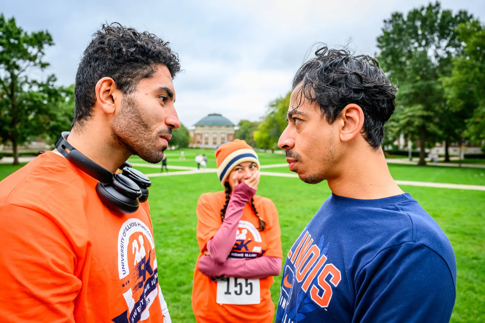 Homecoming 5K competitors stare each other down over who will finish first before the start of the race to the amusement of one of the other runners. In the end, the two celebrated at the finish line side-by-side. (Note: candid moment)