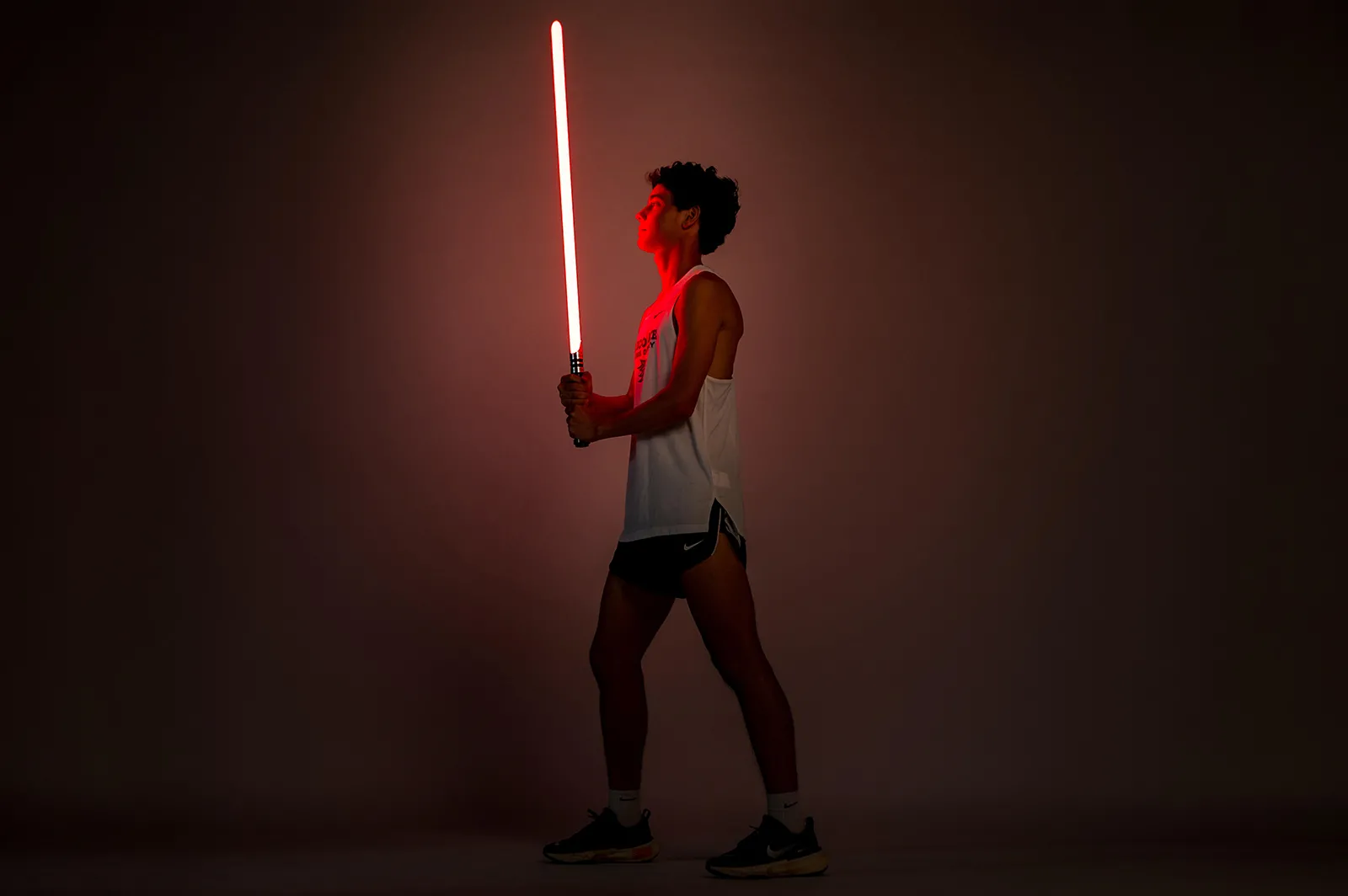 Intercollegiate Athletics (ATHL) Men's Cross Country (MXC) Sean Alliegro holds a light saber on Monday, September 25, 2023 .