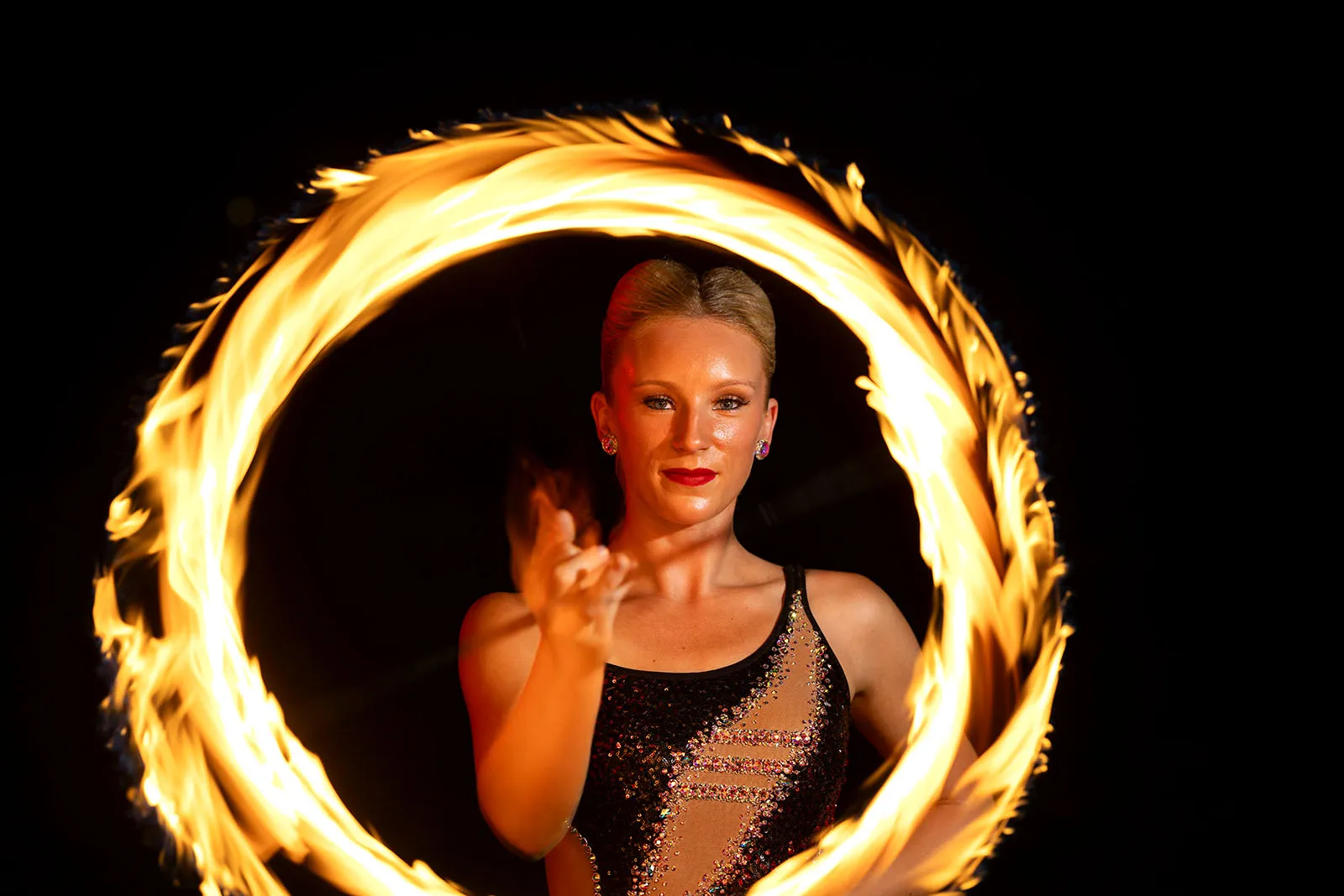 Featured twirler Ally Duda twirls with fire for a portrait highlighting fall season student participants.