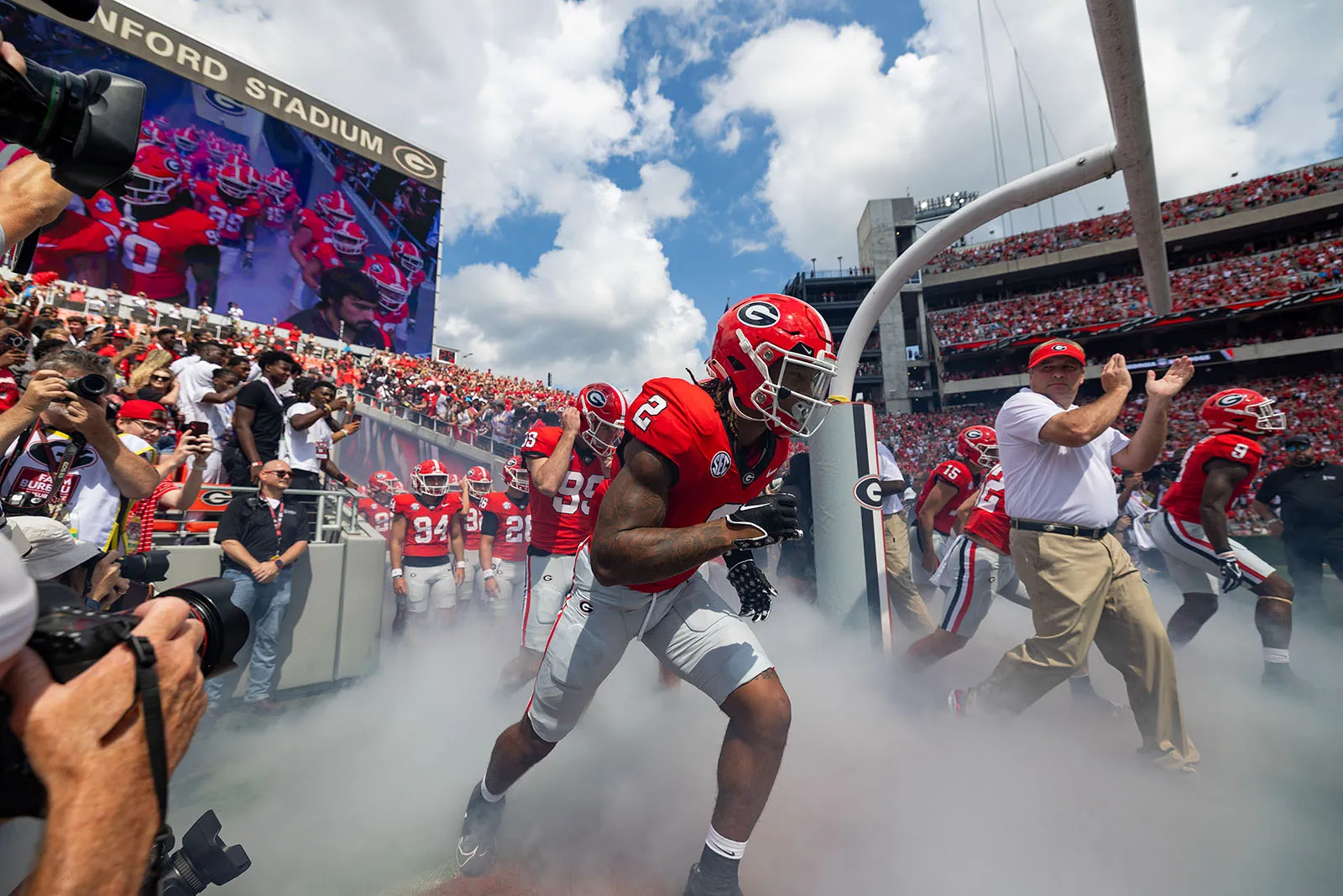 Running back Kendall Milton runs out of the tunnel beside head coach Kirby Smart during the Georgia home game versus Ball State.