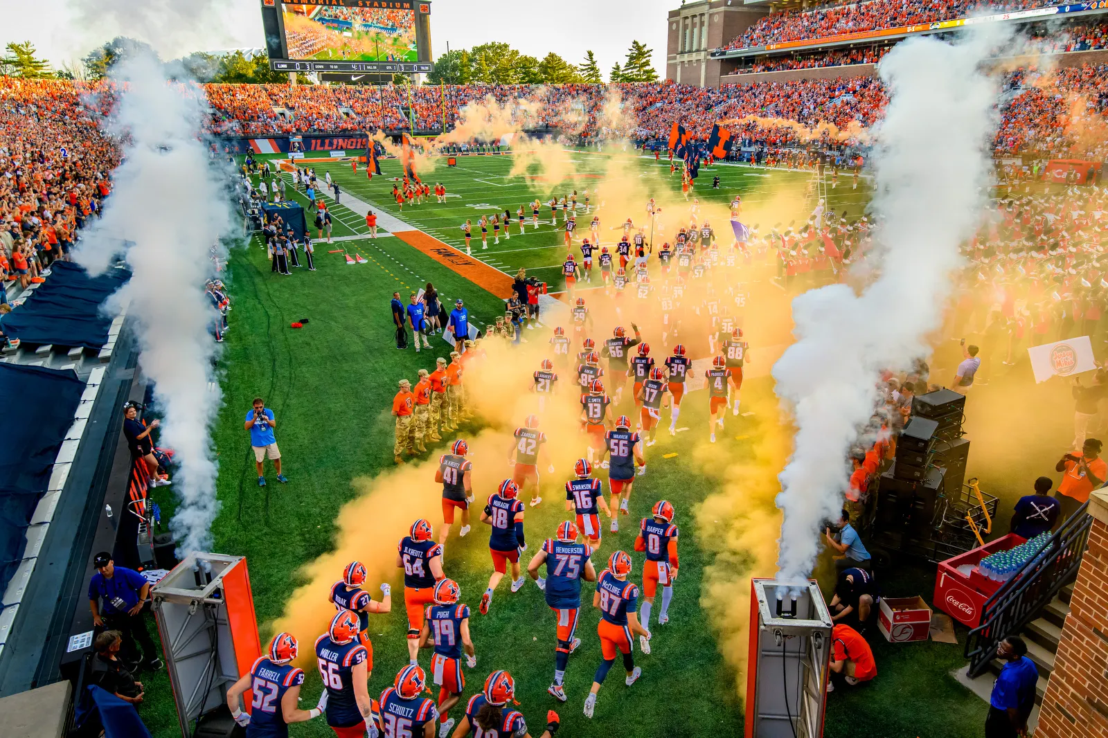 Plumes of orange and white smoke burst into the air as the team takes the field during an evening game for the home opener.