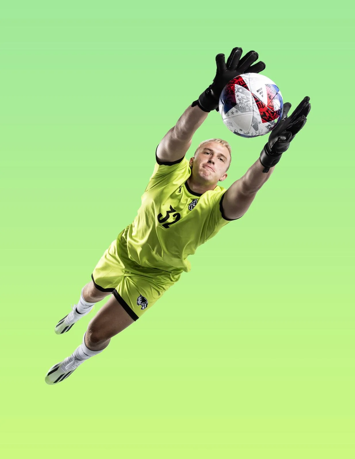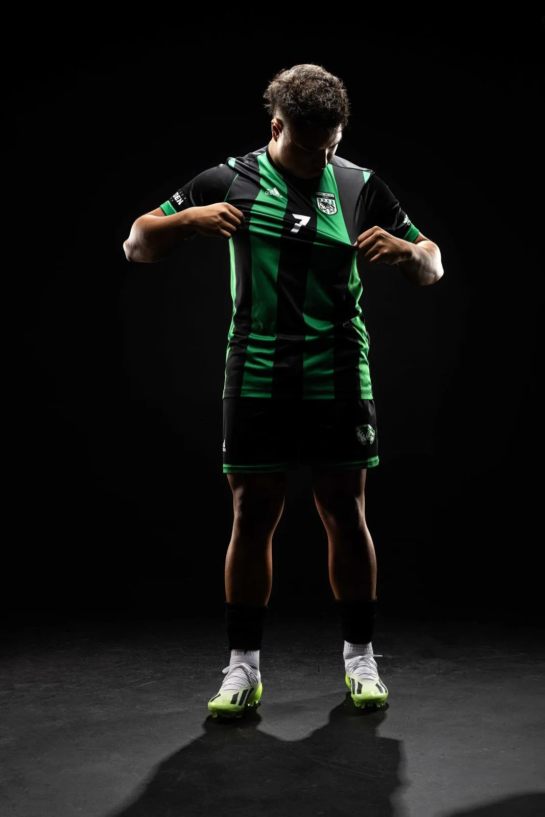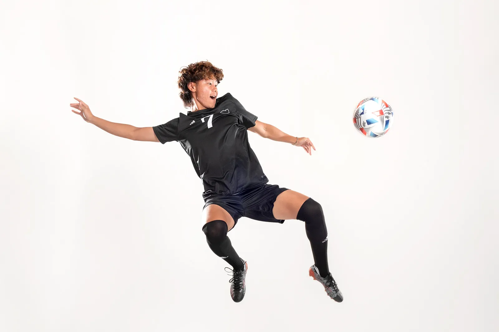 Men’s Soccer (MSOC) #7 Toutaji Lee leaps into the air for promotional photos in the studio on Tuesday, August 15, 2023.