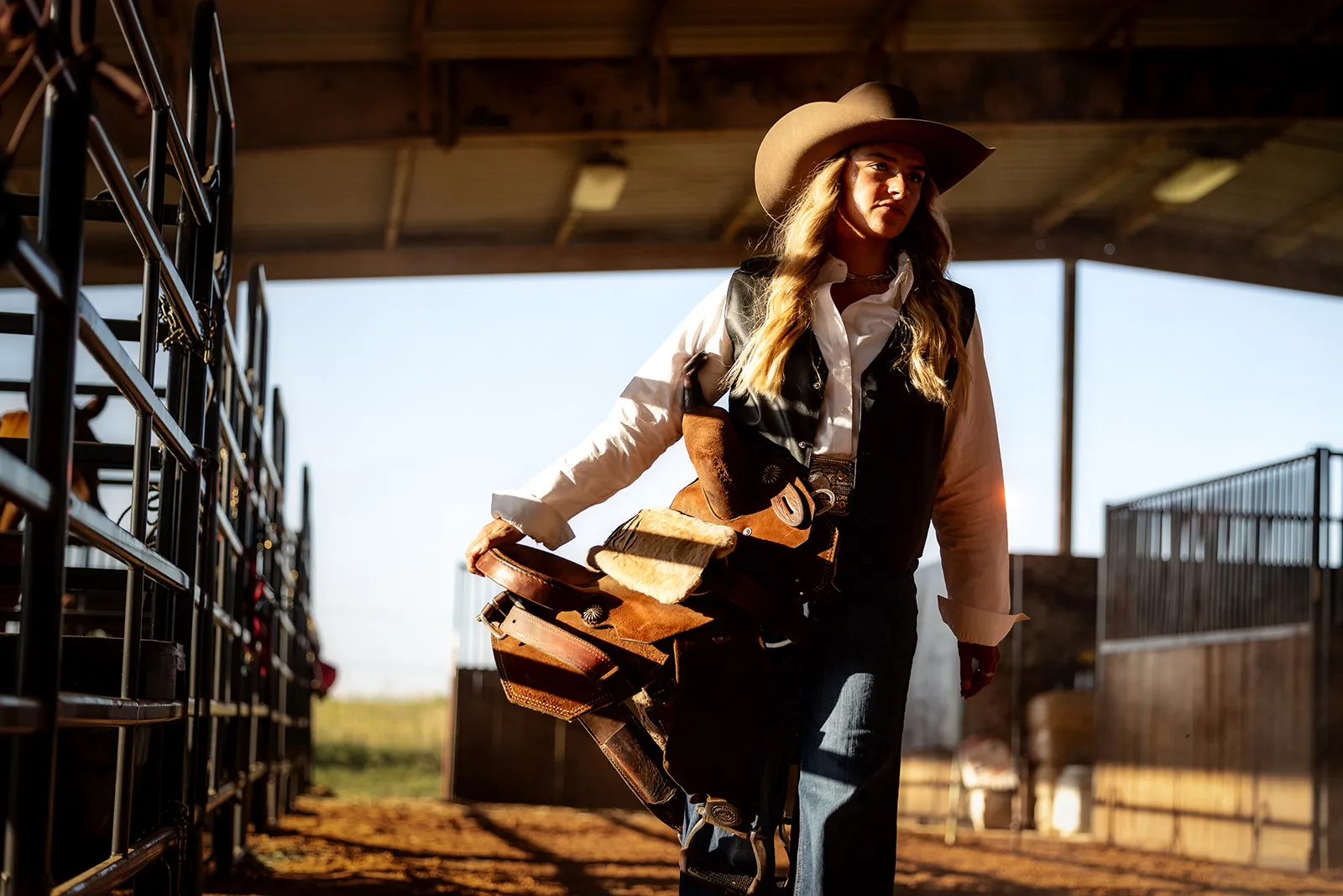 Lyndsey Hollingsworth poses with a saddle at the Rodeo Practice Arena. The Oklahoma State University Rodeo team hosted a media day at Oklahoma State University on Monday, Aug. 28, 2023.