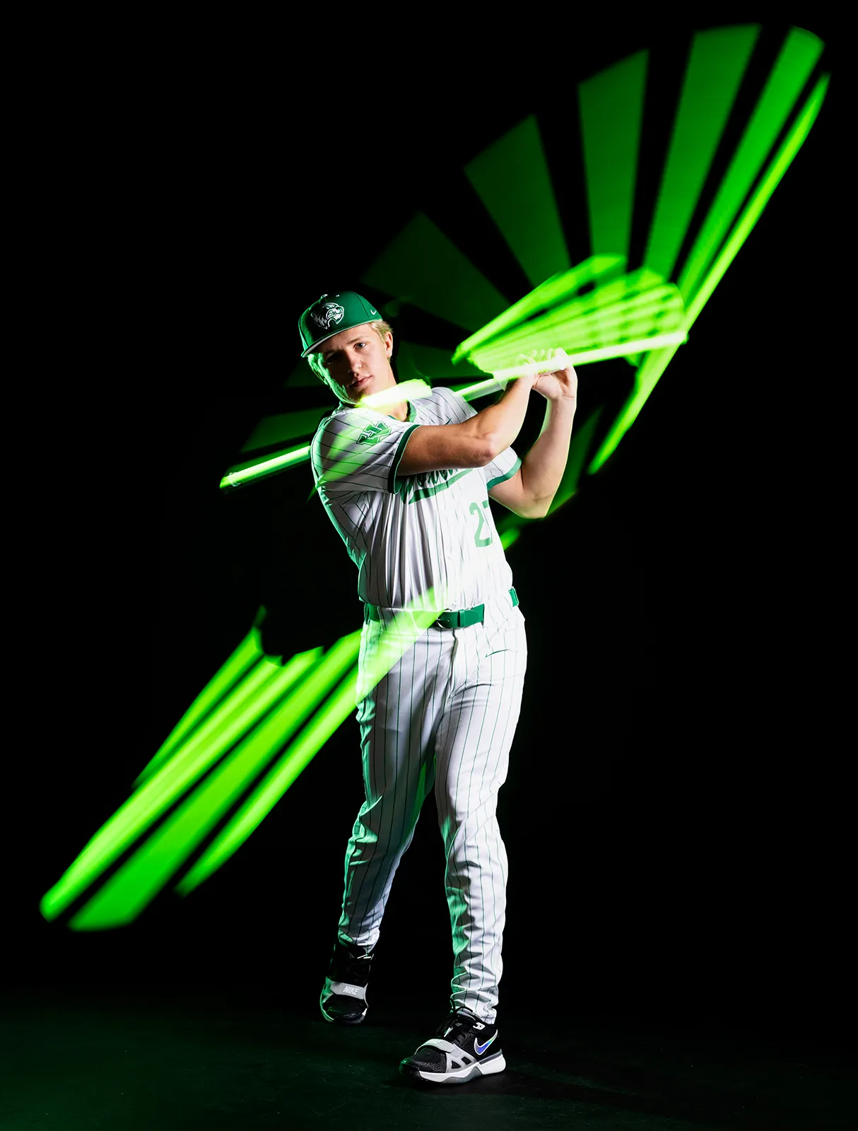 Kent State graduate KJ Jackson, now a standout with the Savannah Bananas, poses at PNC Park in Pittsburgh during a promotional shoot. The portrait connects Kent State athletics with a national stage.