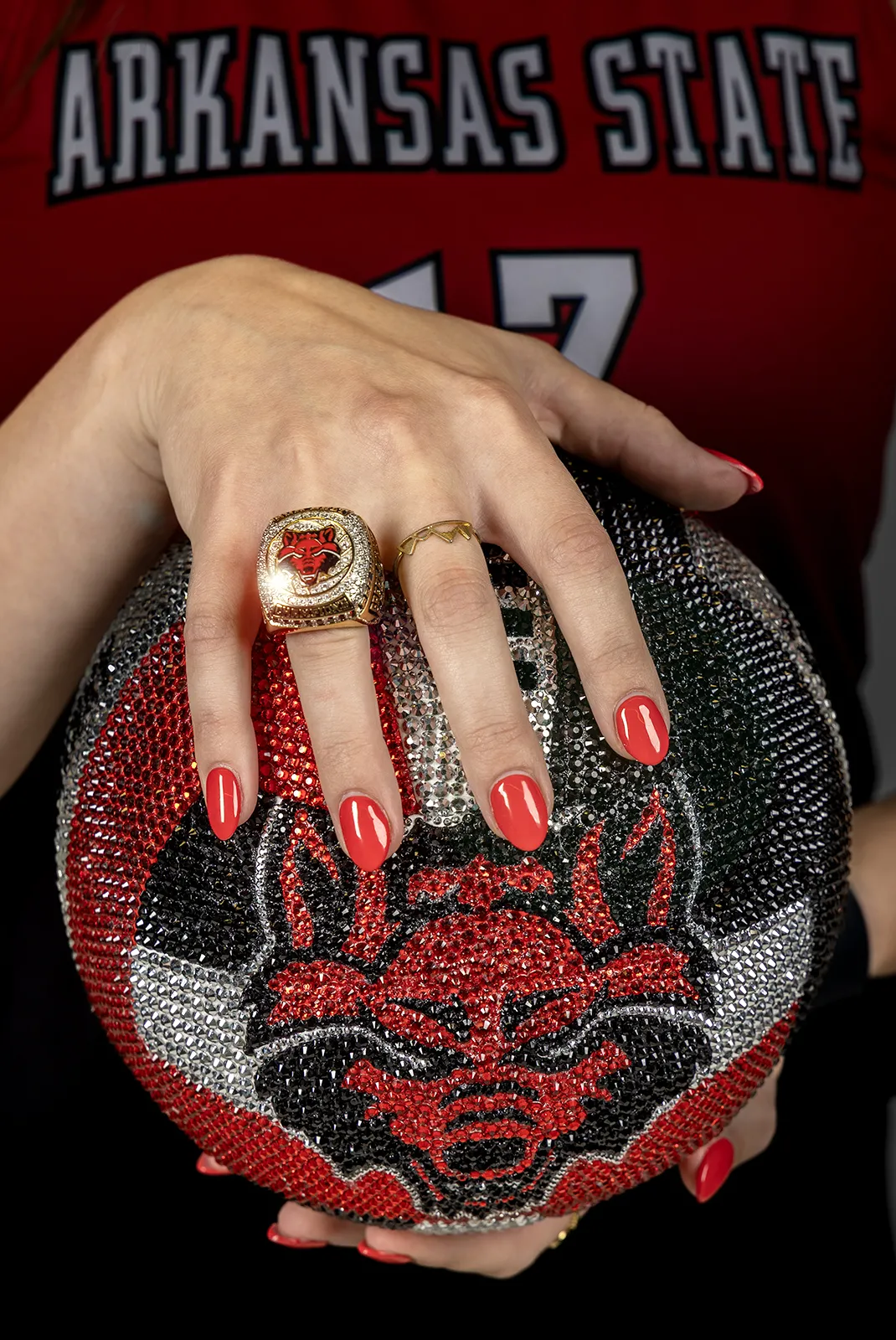 Hailey Gluntz poses with her 2024 Sun Belt Conference Champions Ring and her blinged volleyball during the media day shoot.