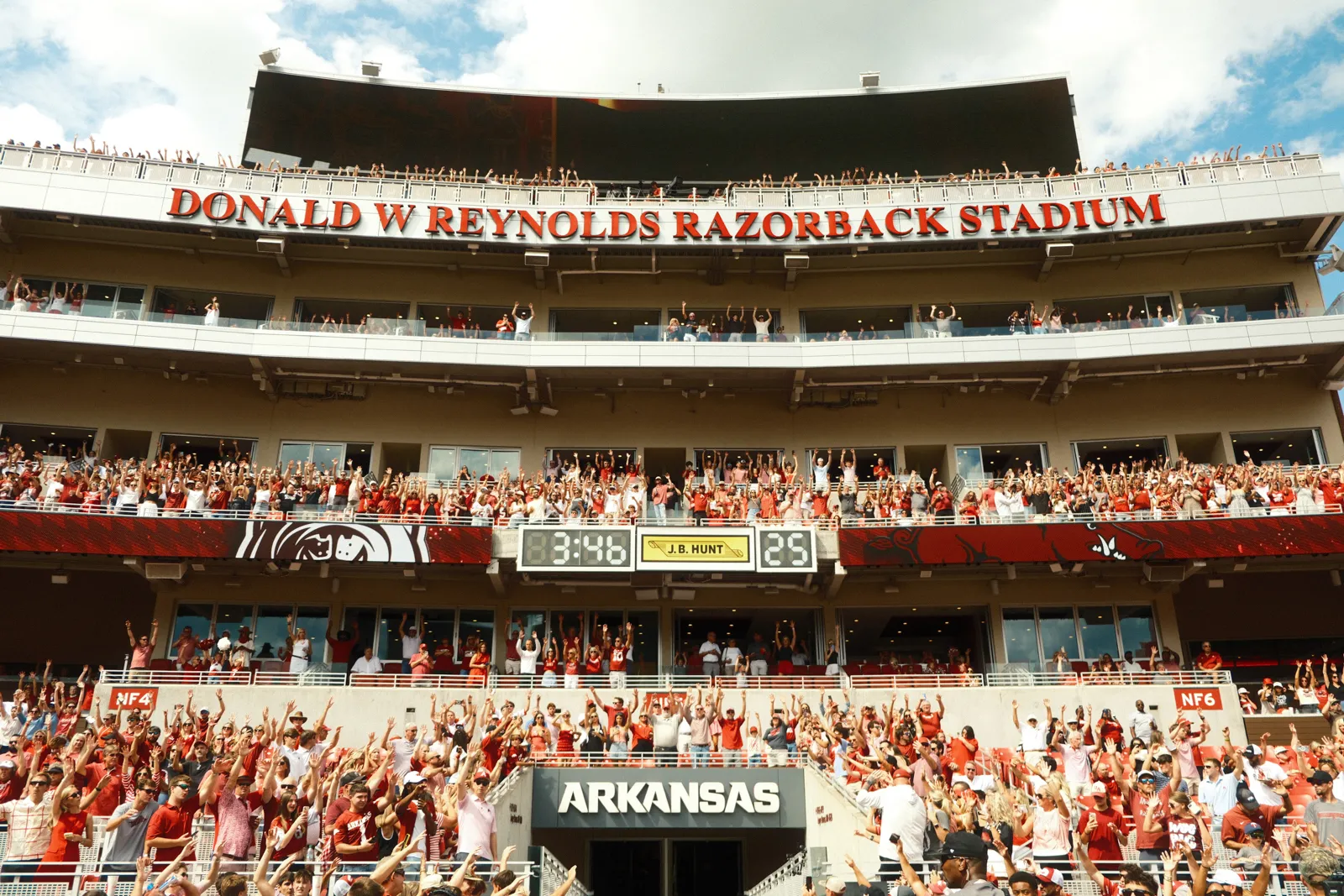 Fans inside Donald W. Reynolds Razorback Stadium join together in the iconic “Calling the Hogs” chant during Arkansas’ season opener against Alabama A&M. The packed stands and raised arms showcase the pride, tradition, and unity of Razorback Nation on game day.