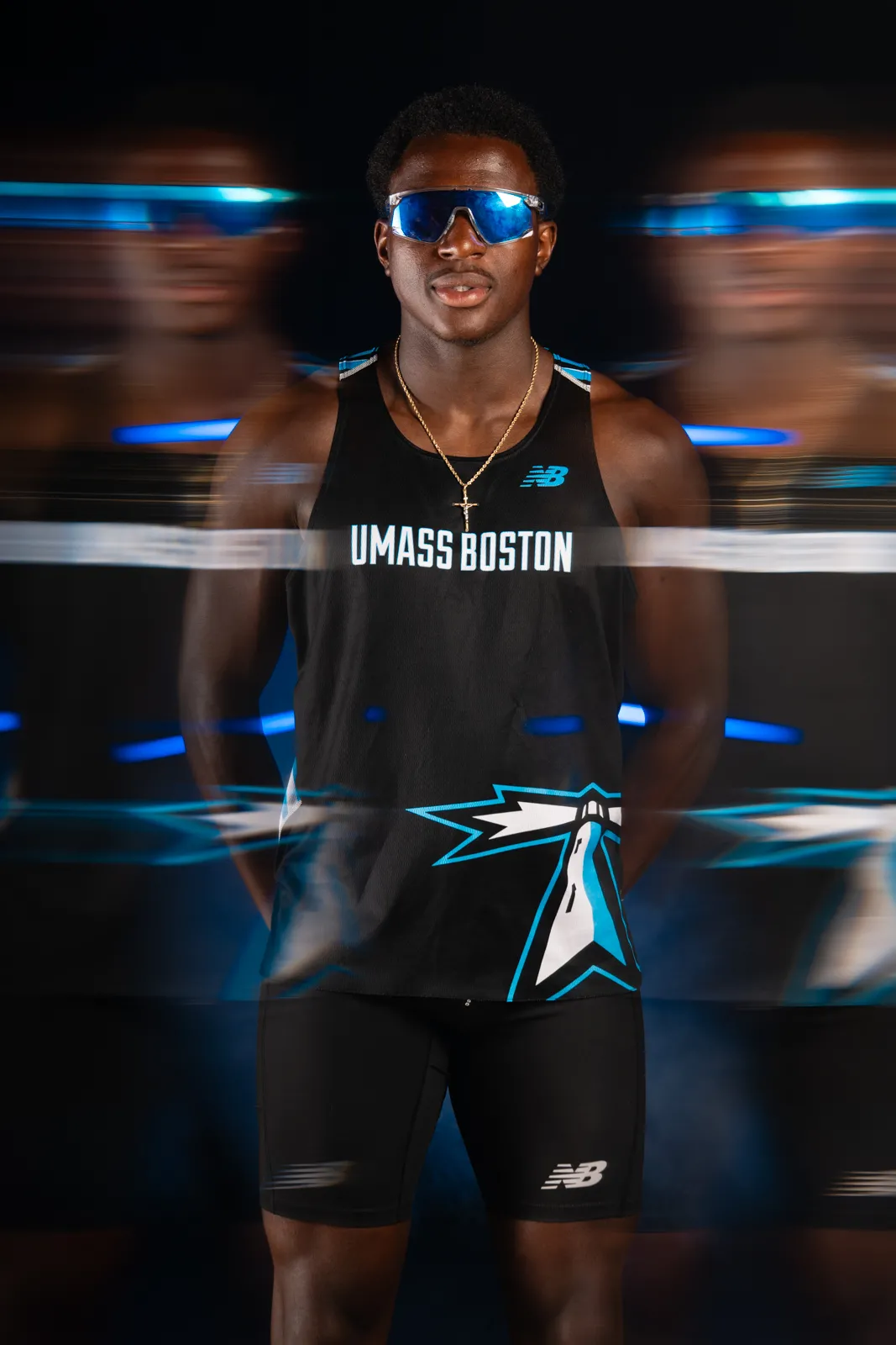 A Umass Boston Track athlete media day image used for marketing and social media posts. The effects on this image were all done in camera with a lens filter.