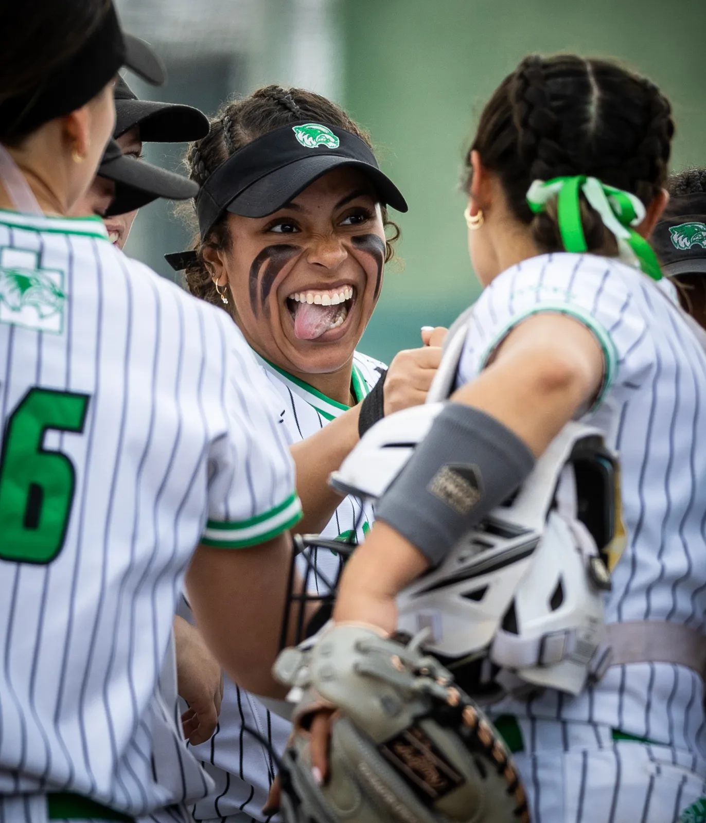 Outfielder #0 Angelique Mann celebrating with teammates after a catch.