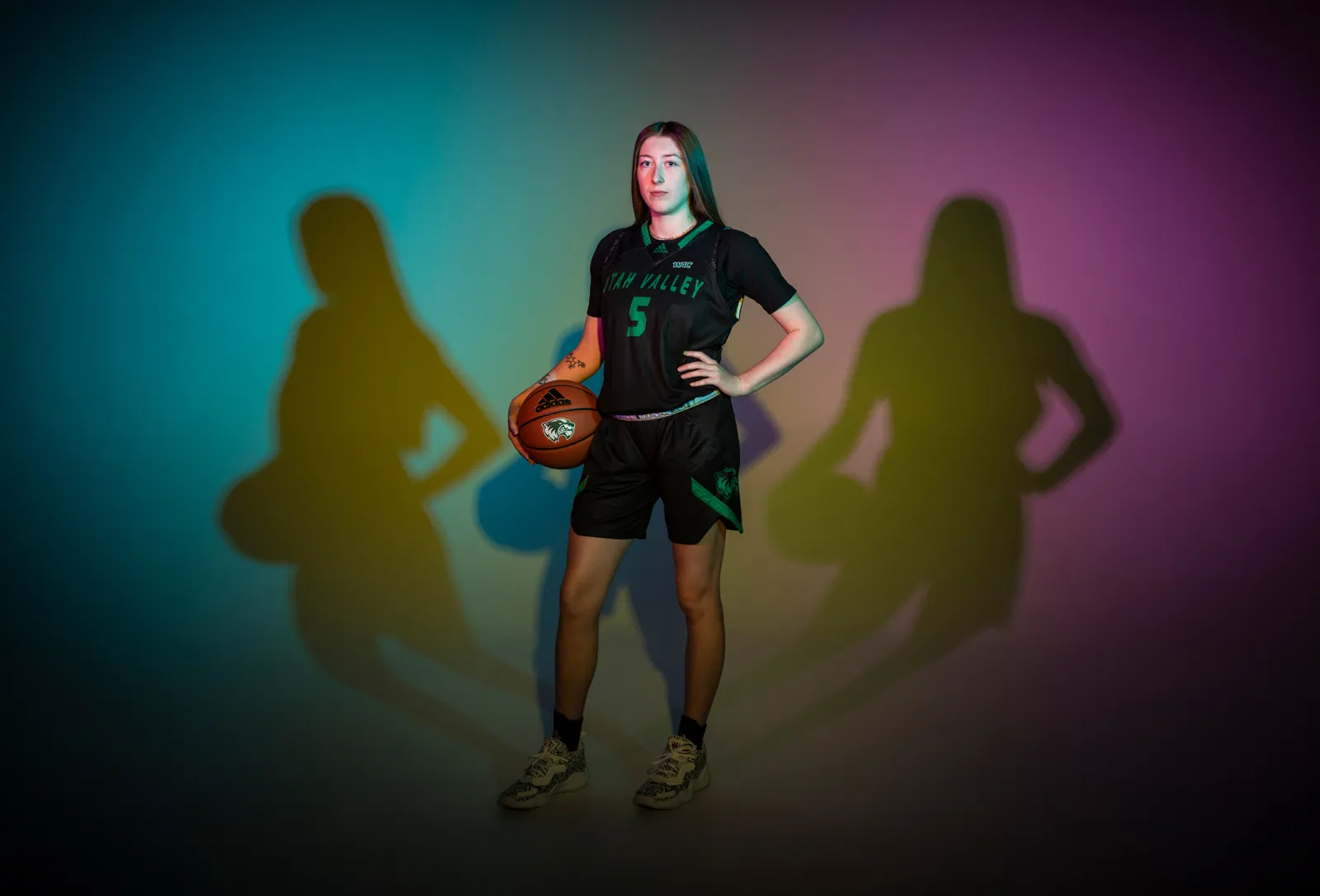 UVU Women's Basketball recruit, Jenna Dick, posing for a portrait in the photo studio.