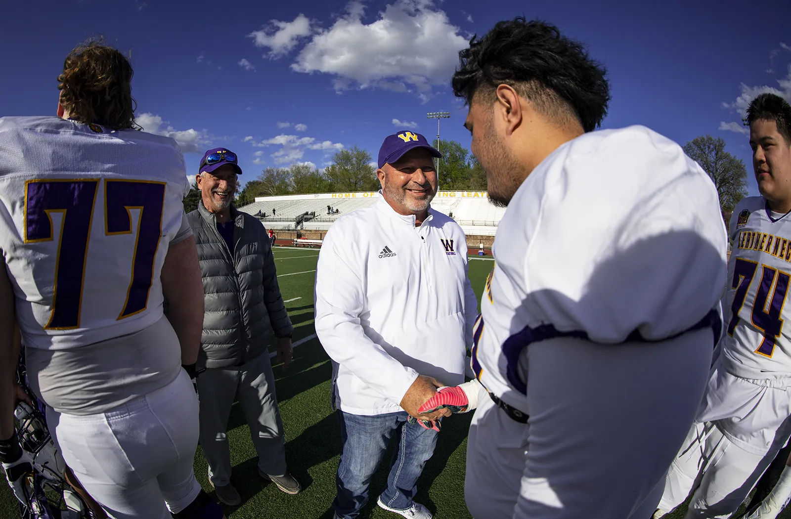 Current players and Alumni participate in the traditional "Leatherneck Handshake" at the Bruce Craddock Spring Game on April 21, 2023. The defense topped the offense with a 27-21 victory.